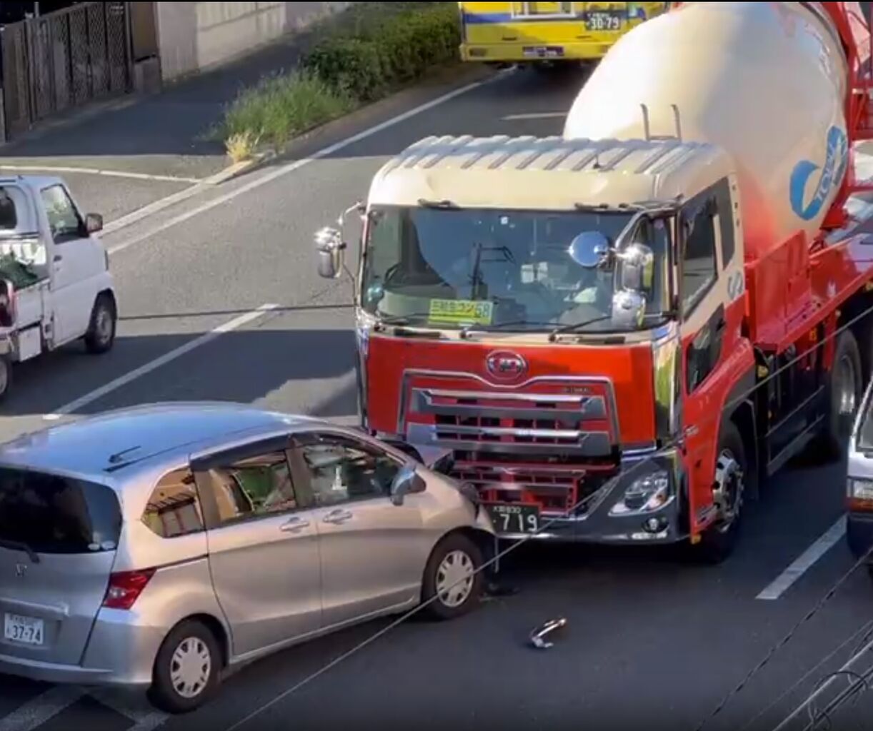 また家の前で事故してる、ミキサー車と乗用車の正面衝突怖い。