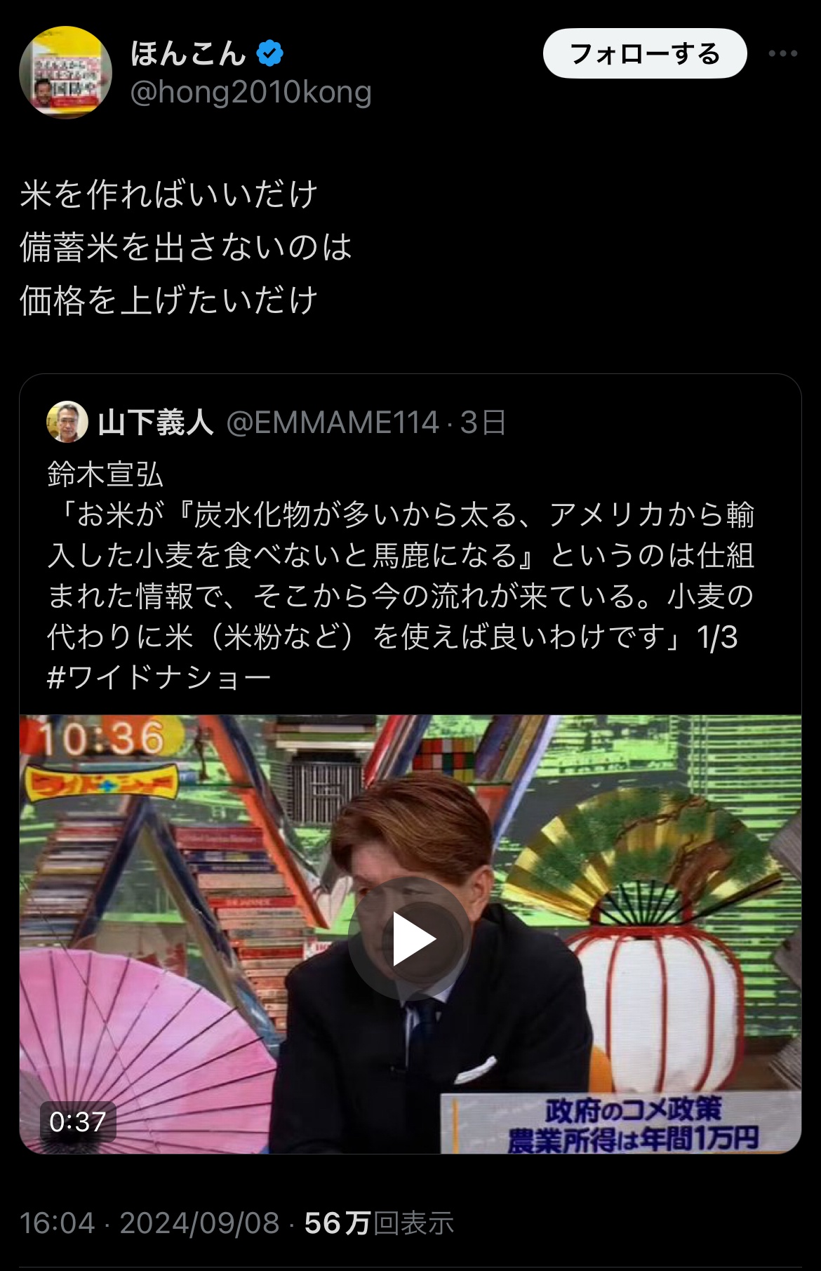 ほんこん「コメは作りゃ良いだけ。備蓄米出せば良いだけ。値段釣り上げるな」 米農家「ほんこんさん…」 2024/9/12 速報 1: ↓ document.write(” + ”); 関連記事 document.write(” + ”); 続きを読む ——— Source: アルファルファモザイク ほんこん「コメは作りゃ良いだけ。備蓄米出せば良いだけ。値段釣り上げるな」 米農家「ほんこんさん…」