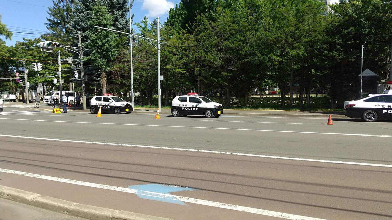 『中央区南14西11の行啓通交番そば、山鼻公園に警察車両集合