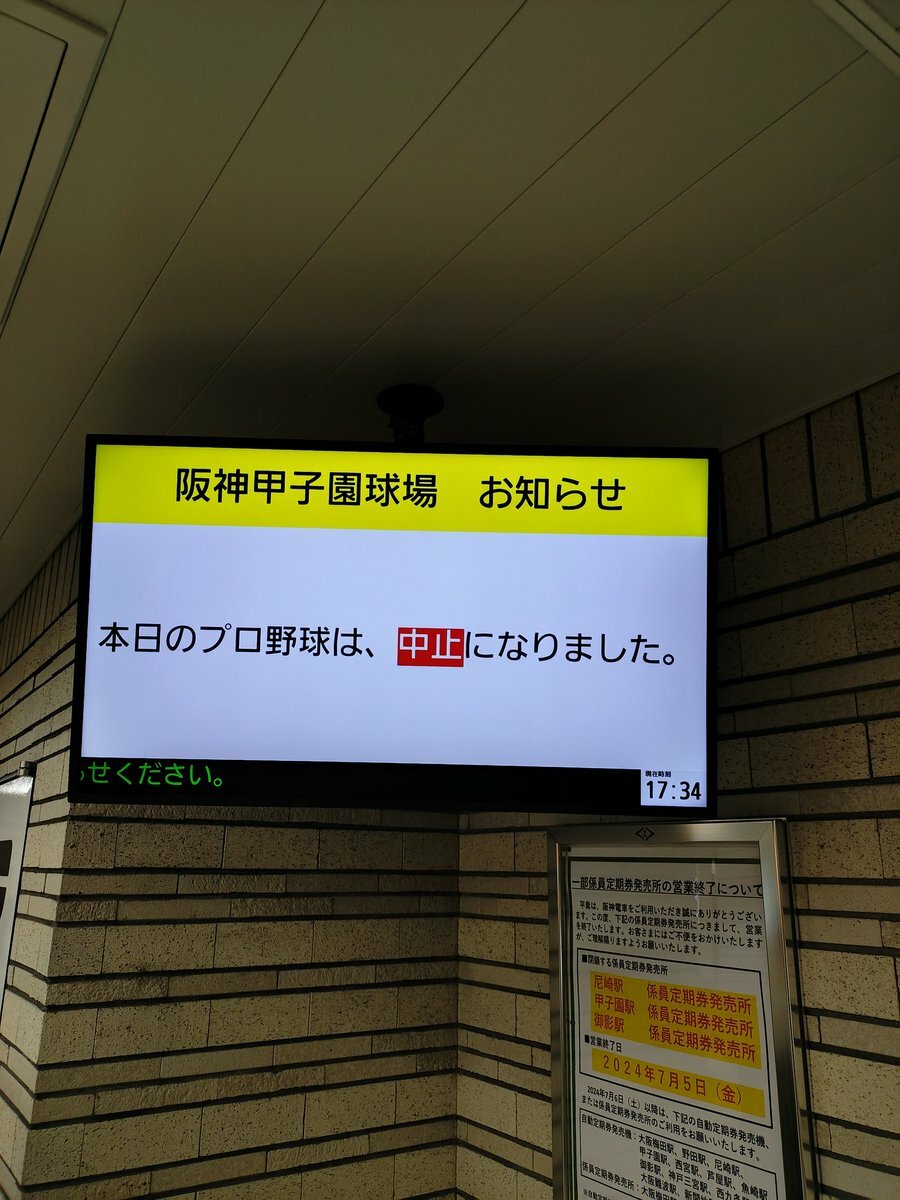本日、2024年9月12日(木)開催予定でした、JERAセントラル・リーグ公式戦 #阪神タイガース vs #横浜DeNAベイスターズ は、天候不良のため中止となりました。 あしからずご了承ください。 #甲子園 #甲子園球場 #ARE_GOES_ON #baystars— 【公式】阪神甲子園球場 (@enjoy_koshien) September 12, 2024