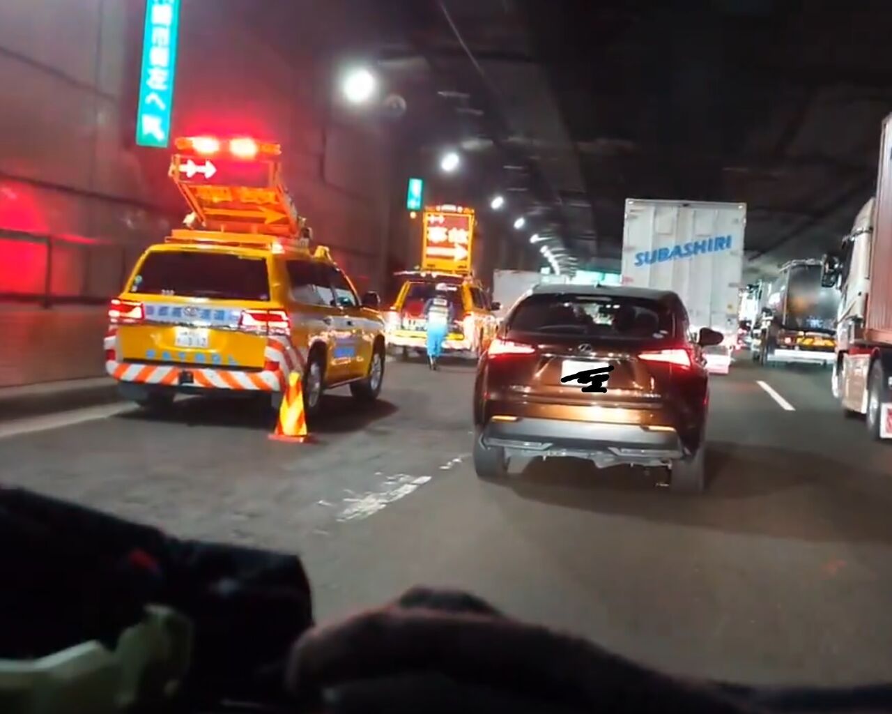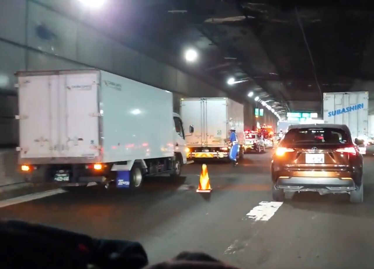 首都高速湾岸線東行川崎航路トンネル内でトラック同士の事故