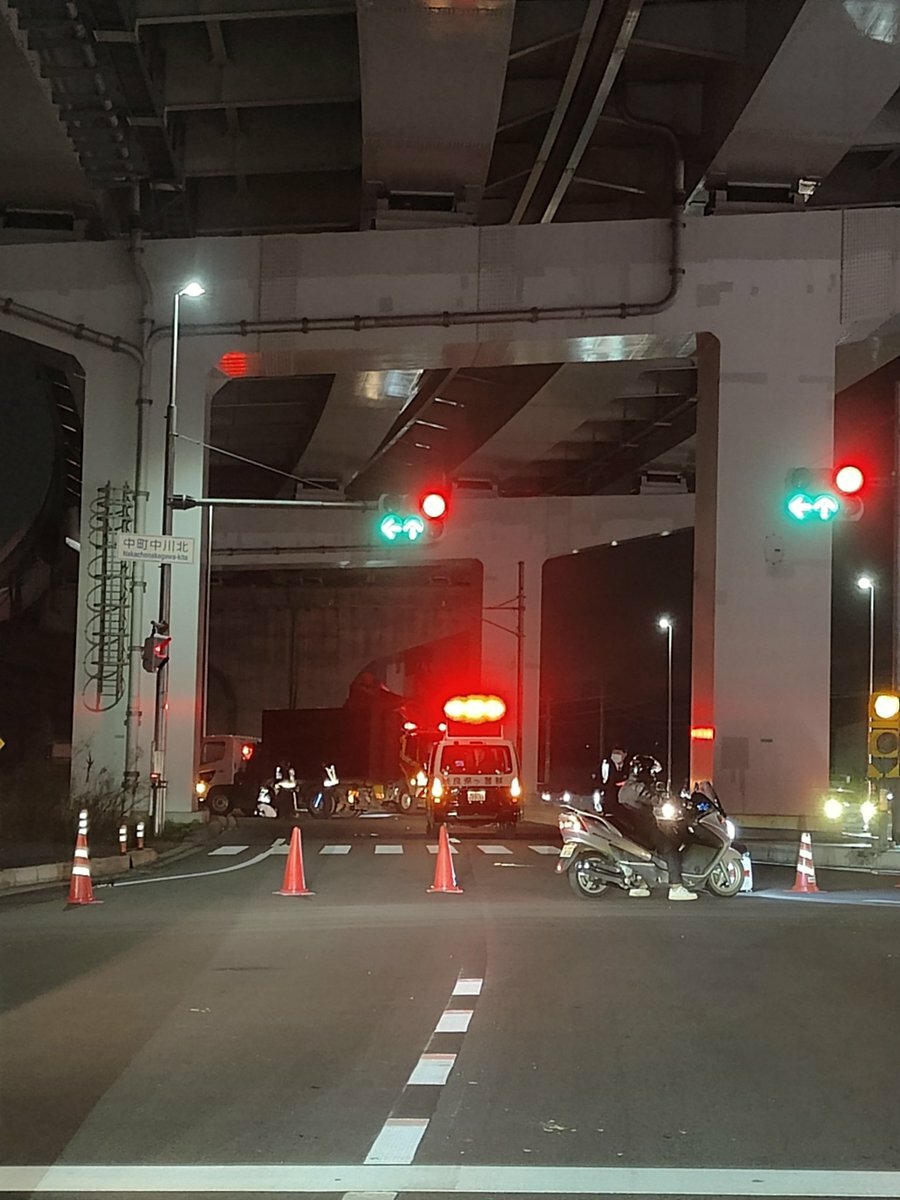 『京奈和の郡山出口でトラックが道塞いでて鬼混んどる…マルハンの真ん前やから、皆んなそこの交差点で強制左折してる』