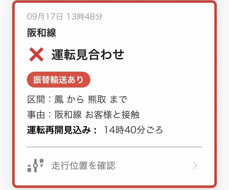 9月17日13時38分現在: 13時34分頃、阪和線:東岸和田駅で列車がお客様と接触したため、鳳駅〜熊取駅間で運転を見合わせています。運転再開は、14時40分頃となる見込みです。 #JR西日本 #阪和線 https://t.co/r3CyDW7tqC pic.twitter.com/5zKLRFeU75