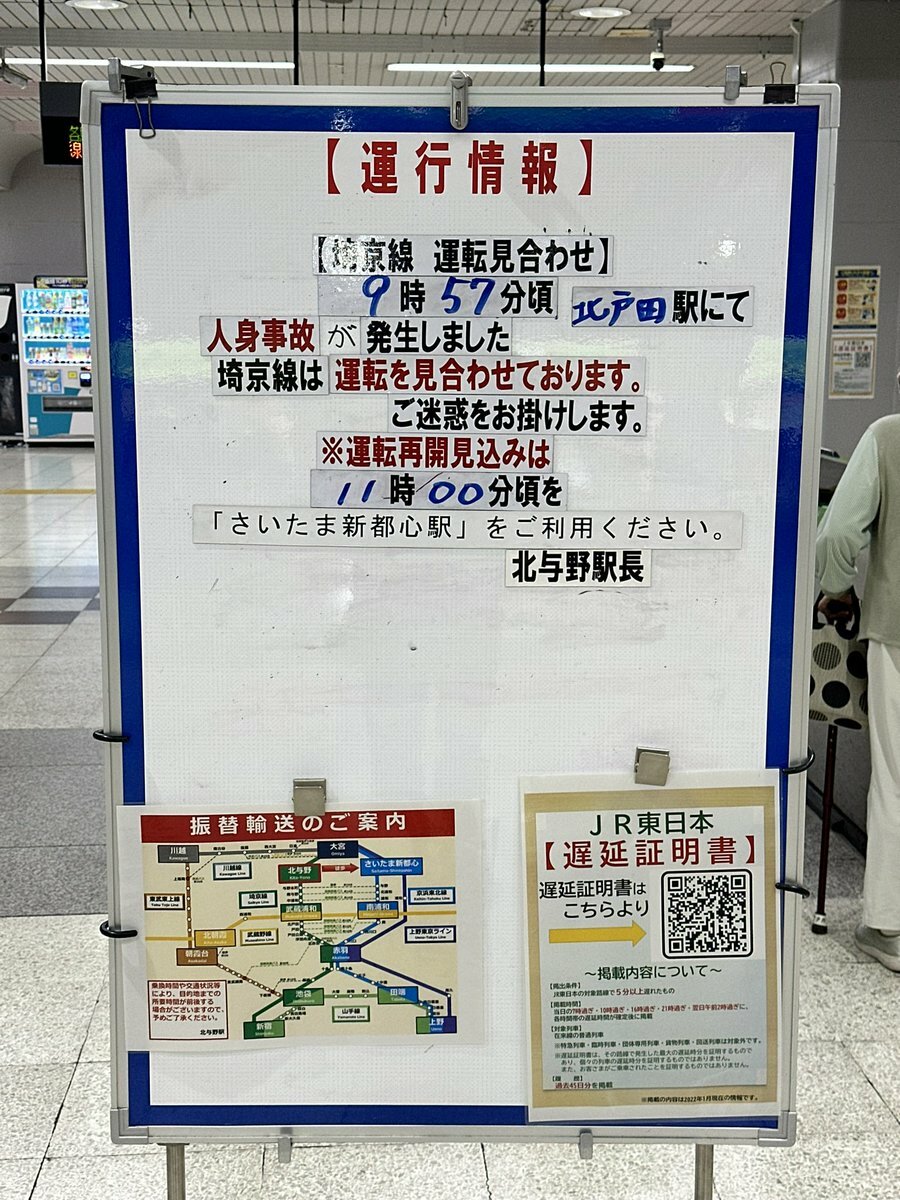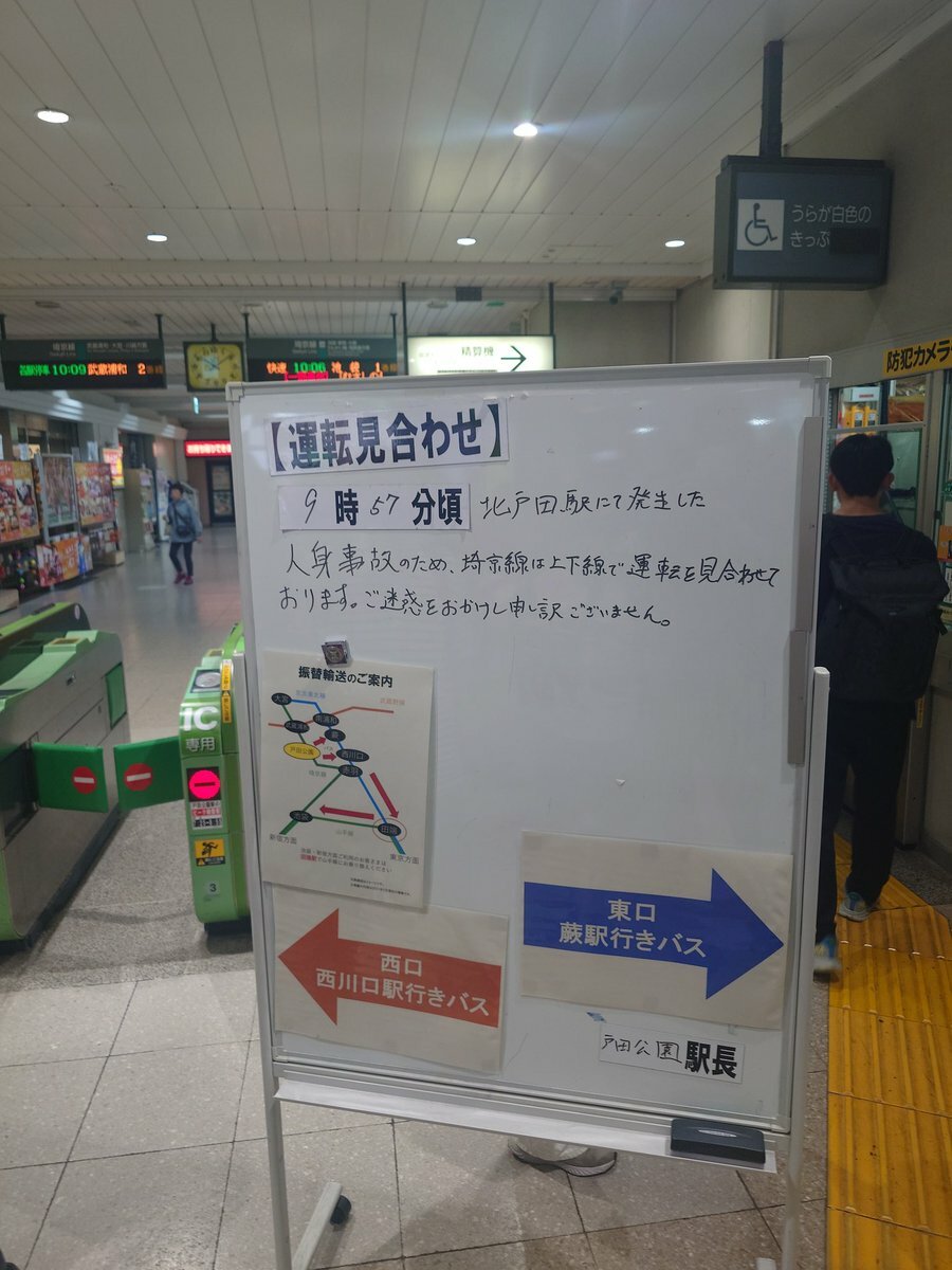 埼京線は、9時55分頃 北戸田駅での人身事故の影響で、上下線で運転を見合わせています。 #埼京線 #Saikyo_Line https://t.co/HbBuJ0JdyU— JR東日本【東北・高崎方面】運行情報 (公式) (@JRE_F_Toho_Taka) September 21, 2024