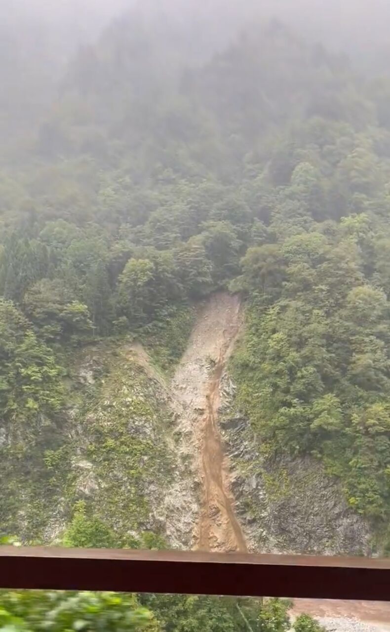 宇奈月温泉トロッコ列車、猫又駅から宇奈月に折り返し始めたところで、土砂崩れにより緊急停止。対岸の山肌を土砂が流れて落ちるのを見て、ちょっと心配していたんだけど、えーっと、お家に帰れるのかな…。#宇奈月温泉トロッコ列車 pic.twitter.com/6iotYglMrv