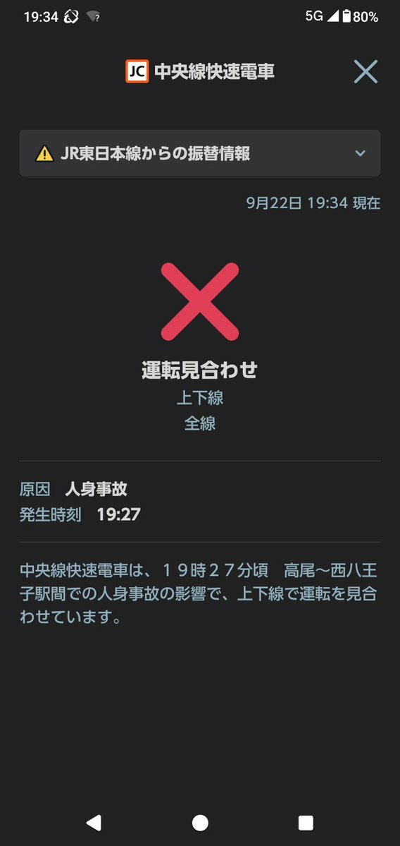中央線快速電車は、19時27分頃 高尾〜西八王子駅間での人身事故の影響で、上下線で運転を見合わせています。 #中央線快速電車 #Chuo_Line https://t.co/Bw82N3lIYZ— JR東日本【中央方面】運行情報 (公式) (@JRE_F_Chuo) September 22, 2024