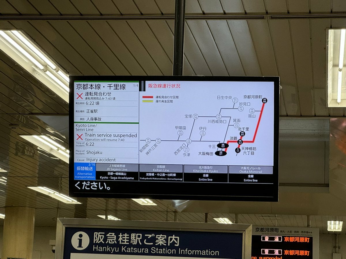 お客さまにお知らせいたします。ただ今、阪急京都線正雀駅での人身事故のため、阪急京都線大阪梅田駅~京都河原町駅の電車の運転を停止しています。再開時刻は08:10を予定しています。— Osaka Metro 運行情報 (@osakatransport) September 22, 2024