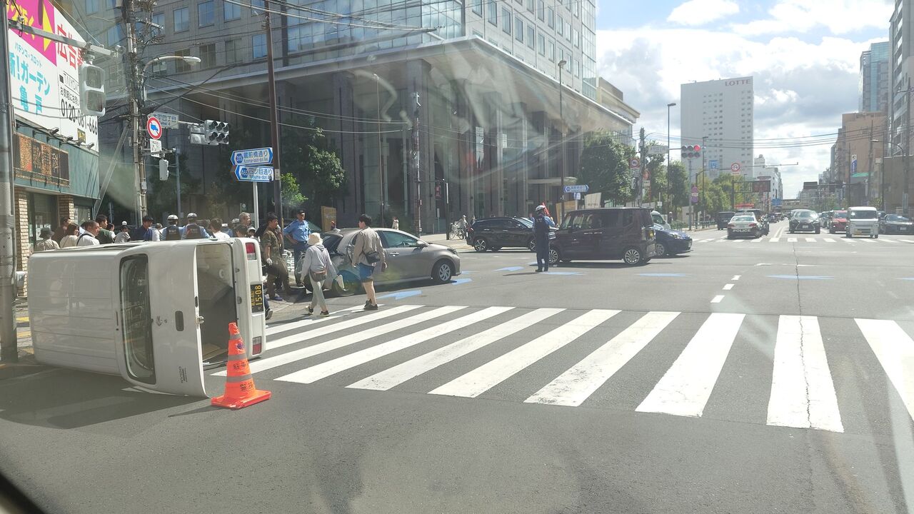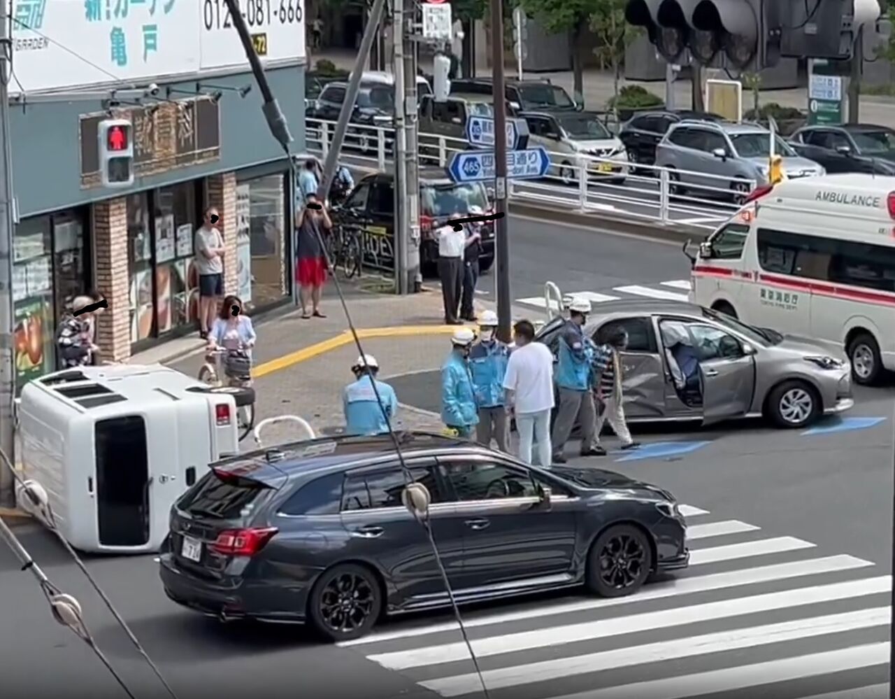 『錦糸町オリナス近くで乗用車2台の横転事故。コンパクトカーの運転手は動けない様子』