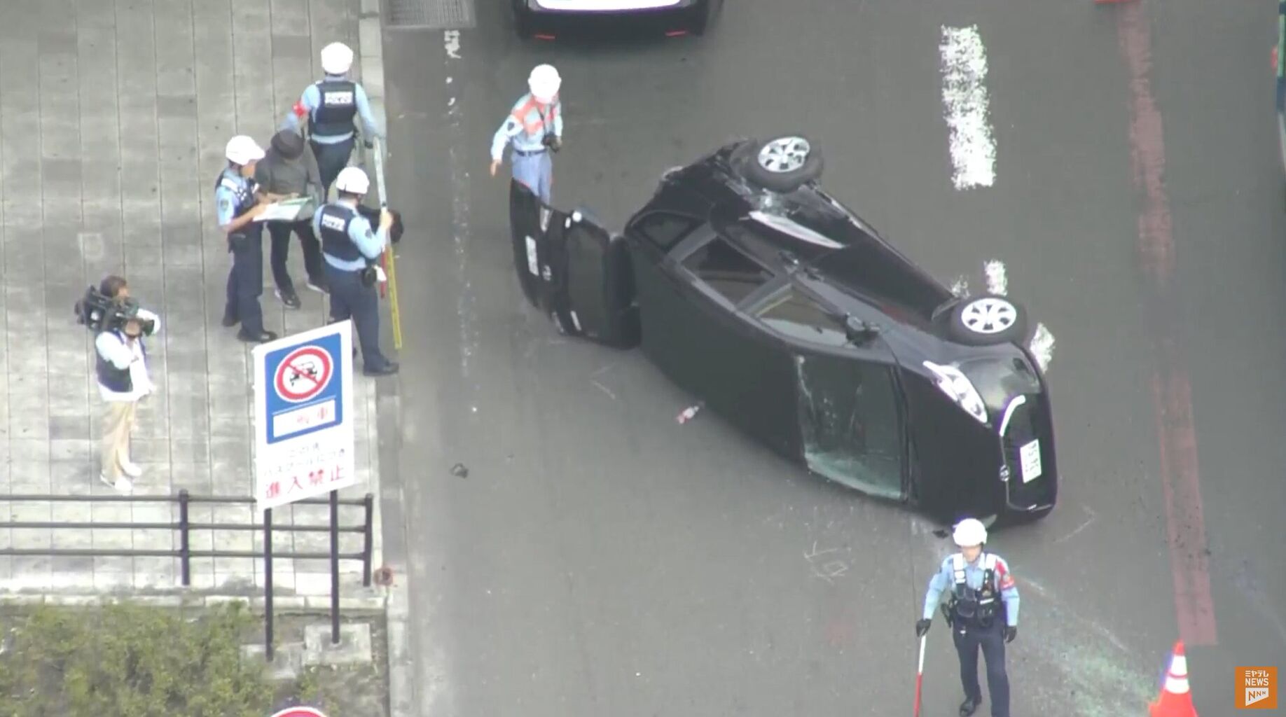 仙台駅の西口ロータリーの交差点で車が横転しとる