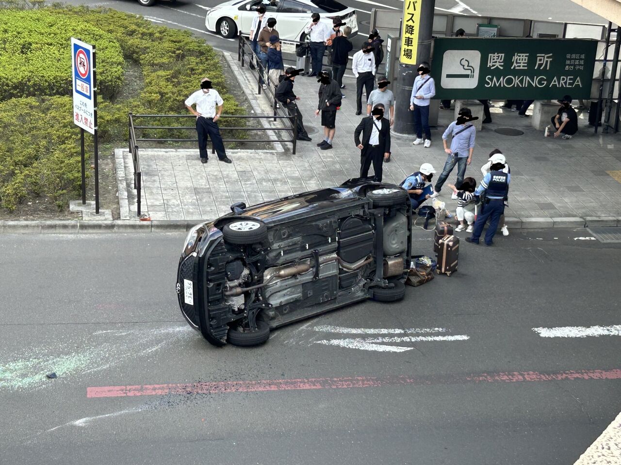 『仙台駅前で横転事故😢真ん中の喫煙所付近』