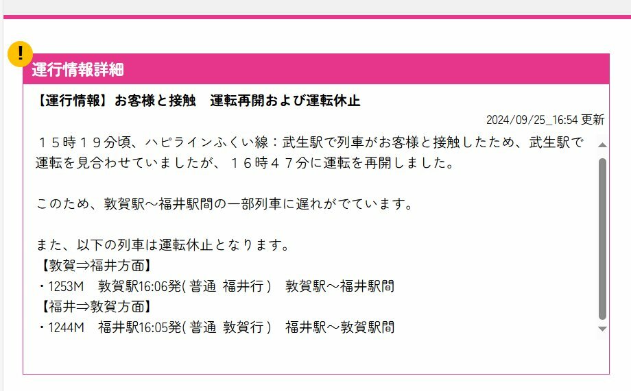 15時19分頃、ハピラインふくい線:武生駅構内で列車がお客様と接触したため、敦賀~鯖江駅間の下り線で運転を見合わせています。