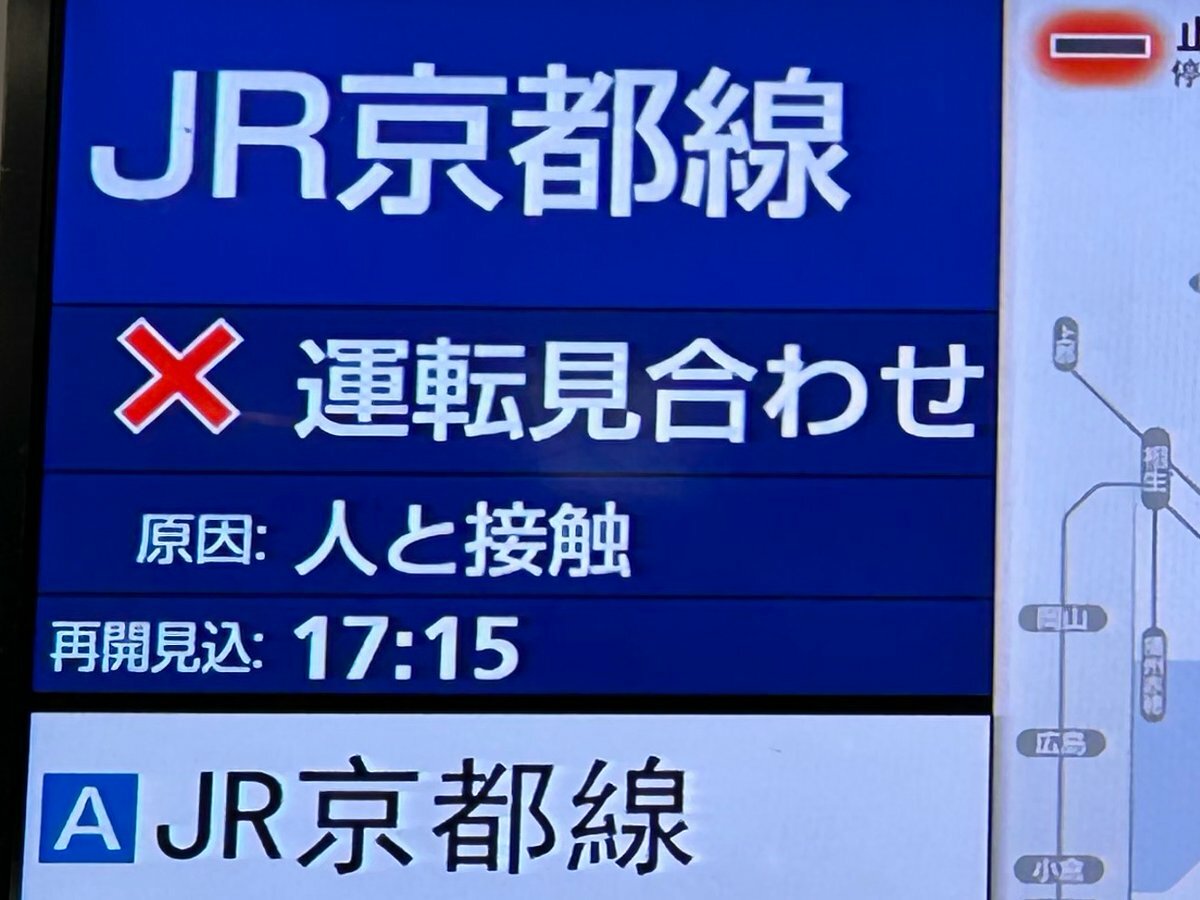 9月26日17時17分現在: 16時09分頃、JR京都線:向日町駅〜長岡京駅間で列車が人と接触したため、京都駅〜高槻駅間で運転を見合わせています。このため、振替輸送を実施しています。運転再開は17時45分頃とお知らせしていましたが、現地の状況により、変更となり18… #JR西日本 https://t.co/S3lsxSBSHi pic.twitter.com/Ah5JFrh8fs