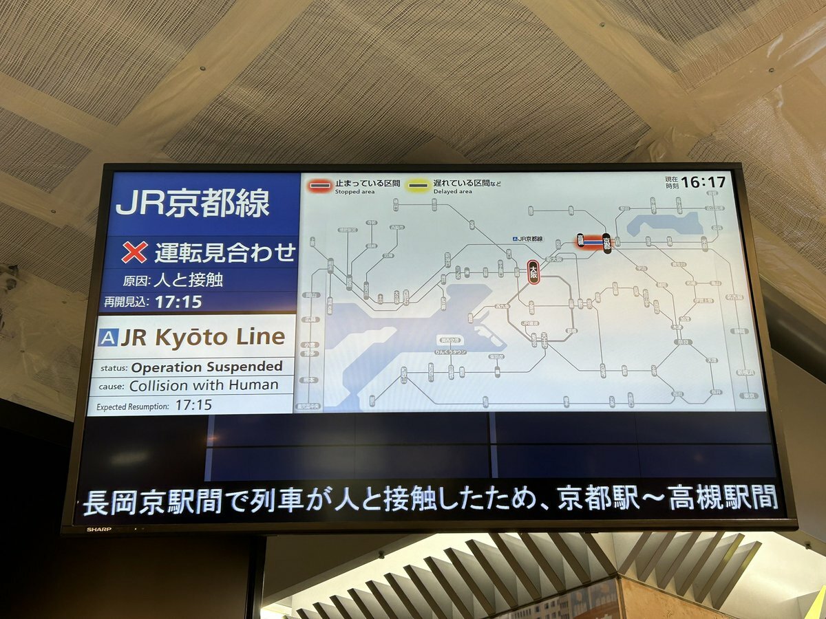 9月26日17時17分現在: 16時09分頃、JR京都線:向日町駅〜長岡京駅間で列車が人と接触したため、京都駅〜高槻駅間で運転を見合わせています。このため、振替輸送を実施しています。運転再開は17時45分頃とお知らせしていましたが、現地の状況により、変更となり18… #JR西日本 https://t.co/4krO359x1k pic.twitter.com/cBikBxkoMU