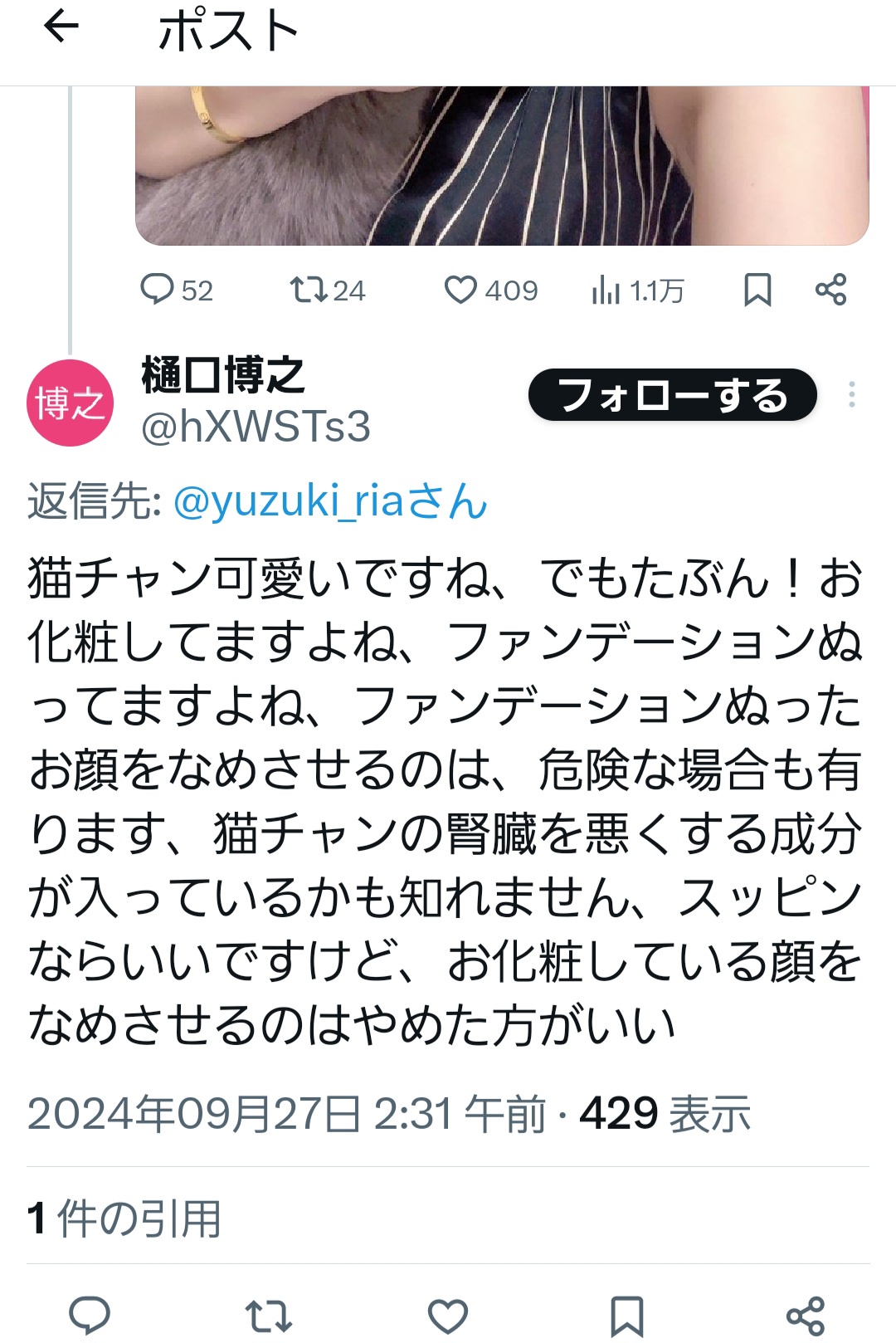 【地獄絵図】セクシー女優さん、猫好きおじさんの親切なアドバイスに逆ギレ激怒wwww 2024/9/27 速報 1: https://imgur.com/8fMrZ9w.jpg — (@yuzuki_ria) document.write(” + ”); 関連記事 document.write(” + ”); 続きを読む ——— Source: アルファルファモザイク 【地獄絵図】セクシー女優さん、猫好きおじさんの親切なアドバイスに逆ギレ激怒wwww
