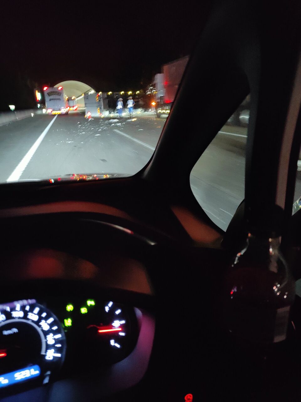 3車線の真ん中でひっくり返ってます。トンネル入り口前なので、通行される方は気をつけて下さい。