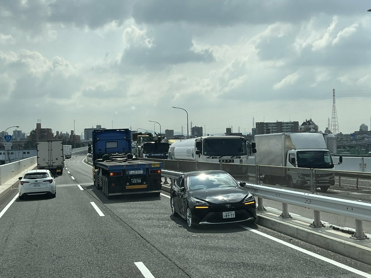 国道23号線の知立バイパス上り西中インター付近でトレーラーと乗用車の接触事故⚠️