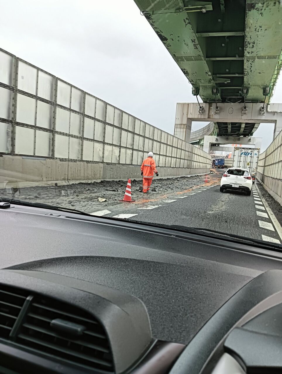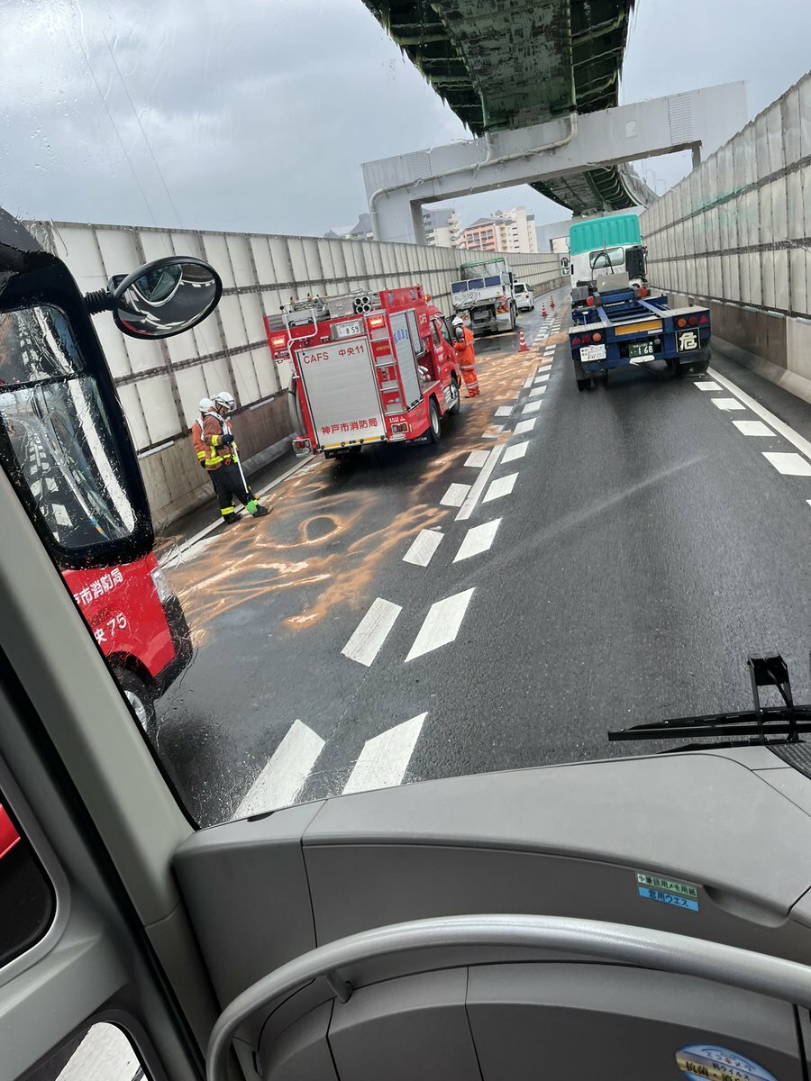【現場の様子】#交通情報 #ハーバーハイウェイ 東行き 兵庫県神戸市灘区灘浜大橋付近 破片散乱油漏洩する大型ダンプ事故で規制渋滞10月3日 #渋滞 #兵庫県 #神戸
