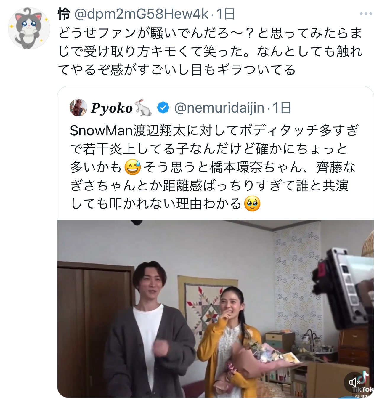 【動画】女優がSnowMan渡辺翔太に対してボディタッチ多すぎで若干炎上←騒すぎだろと見てみたら… 2024/10/6 速報 1: https://video.twimg.com/amplify_video/1842121111892611072/vid/avc1/1280×720/t5ZM_9J768R23Ra_.mp4 — (@nemuridaijin) document.write(” + ”); 関連記事 document.write(” + ”); 続きを読む ——— Source: アルファルファモザイク 【動画】女優がSnowMan渡辺翔太に対してボディタッチ多すぎで若干炎上←騒すぎだろと見てみたら…