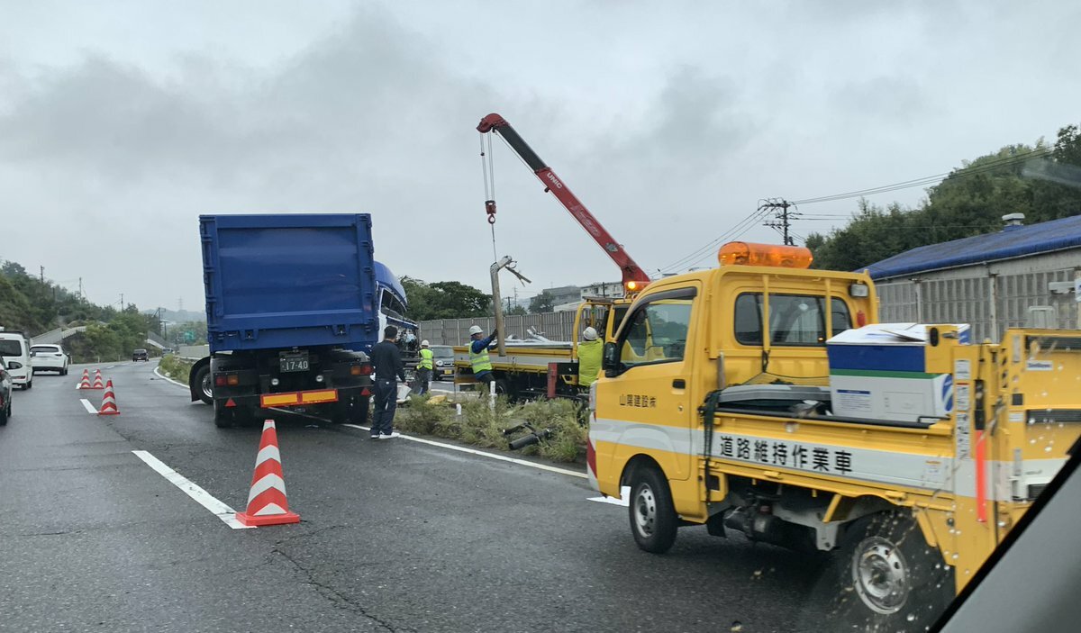 『尾道バイパス合流渋滞してると思ったらトレーラーが中央分離帯に刺さる玉突き事故らしい』