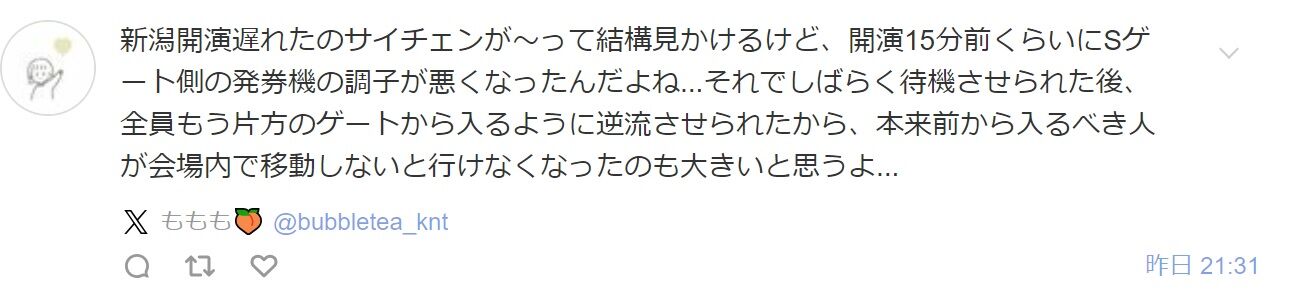 『いつも通りリアフェで会場入ろうと思ったら、指定のゲート(前)で「発券機が使えなくなったから後ろから入ってください~」って言われたから、今日の激混みの悪夢の原因の1つはそれだと思う。』