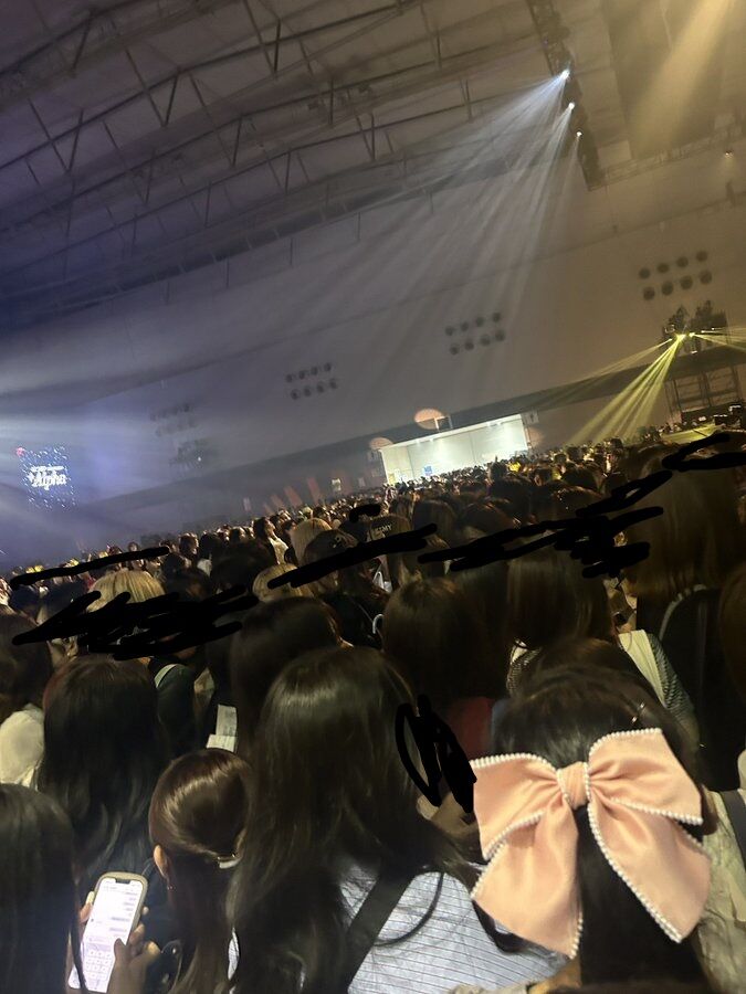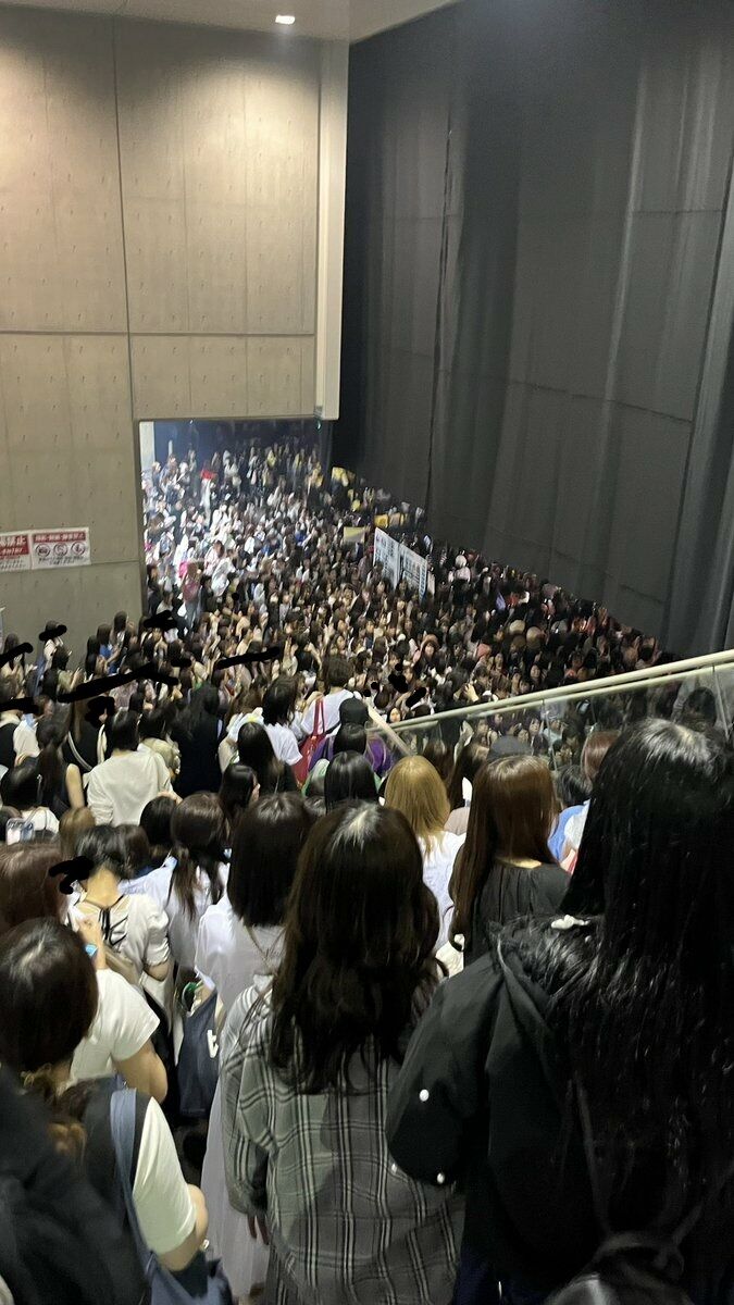 『ちなみにD1からB4行くまでに30分以上かかりましたサイチェンどころか座席着くのすらままならなかったよ‼️入場口から発券して降りる階段もオタクで溢れかえって、ブロックの曲がり角では押し合いへし合いでパイプ椅子にオタクが突っ込んで転んでた』