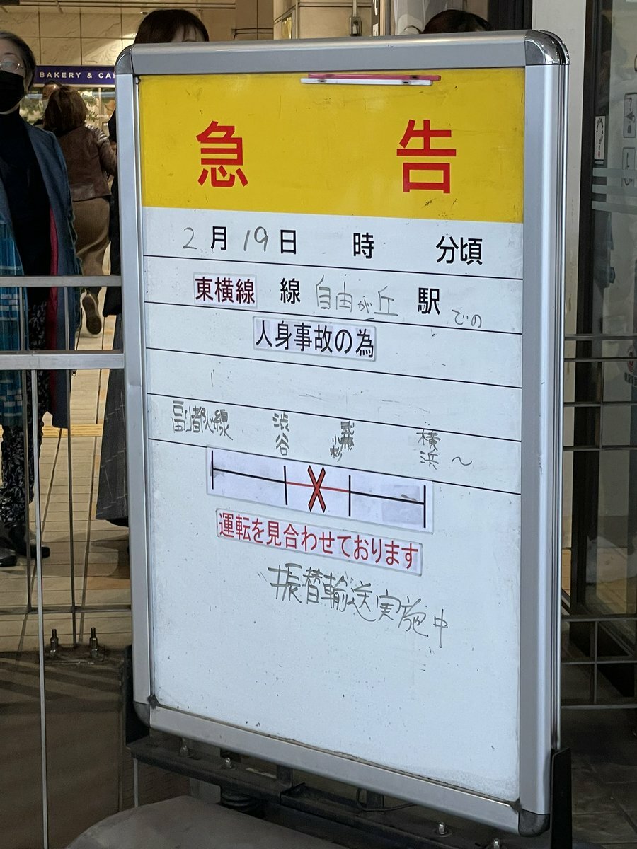 02月19日09時38分現在【ダイヤ乱れ】9時21分頃、東急東横線 自由が丘駅で人身事故のため、ダイヤが乱れています。この影響で東急東横線、東武東上線との直通運転を中止しています。 https://t.co/qSP7JMw6kI