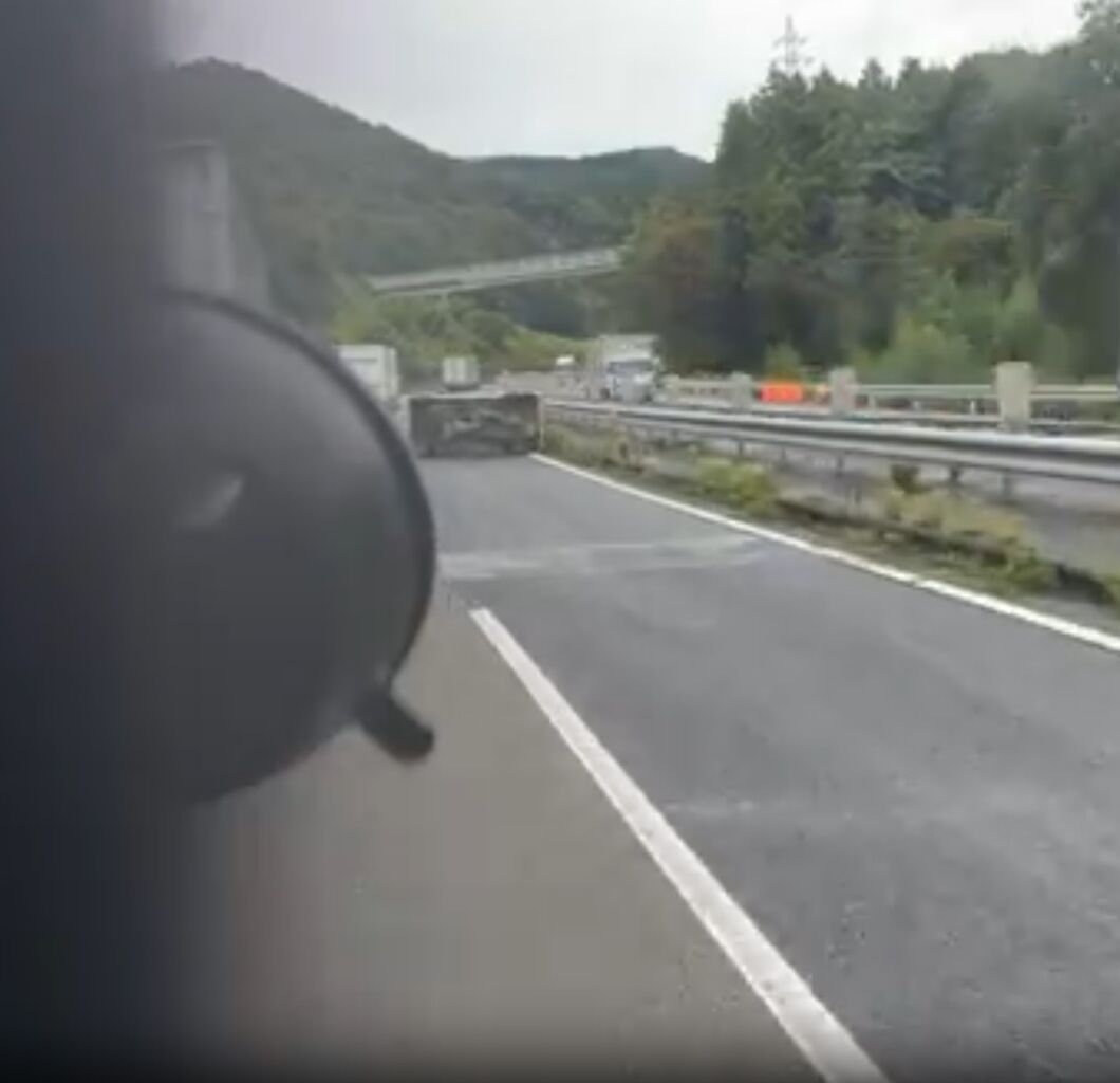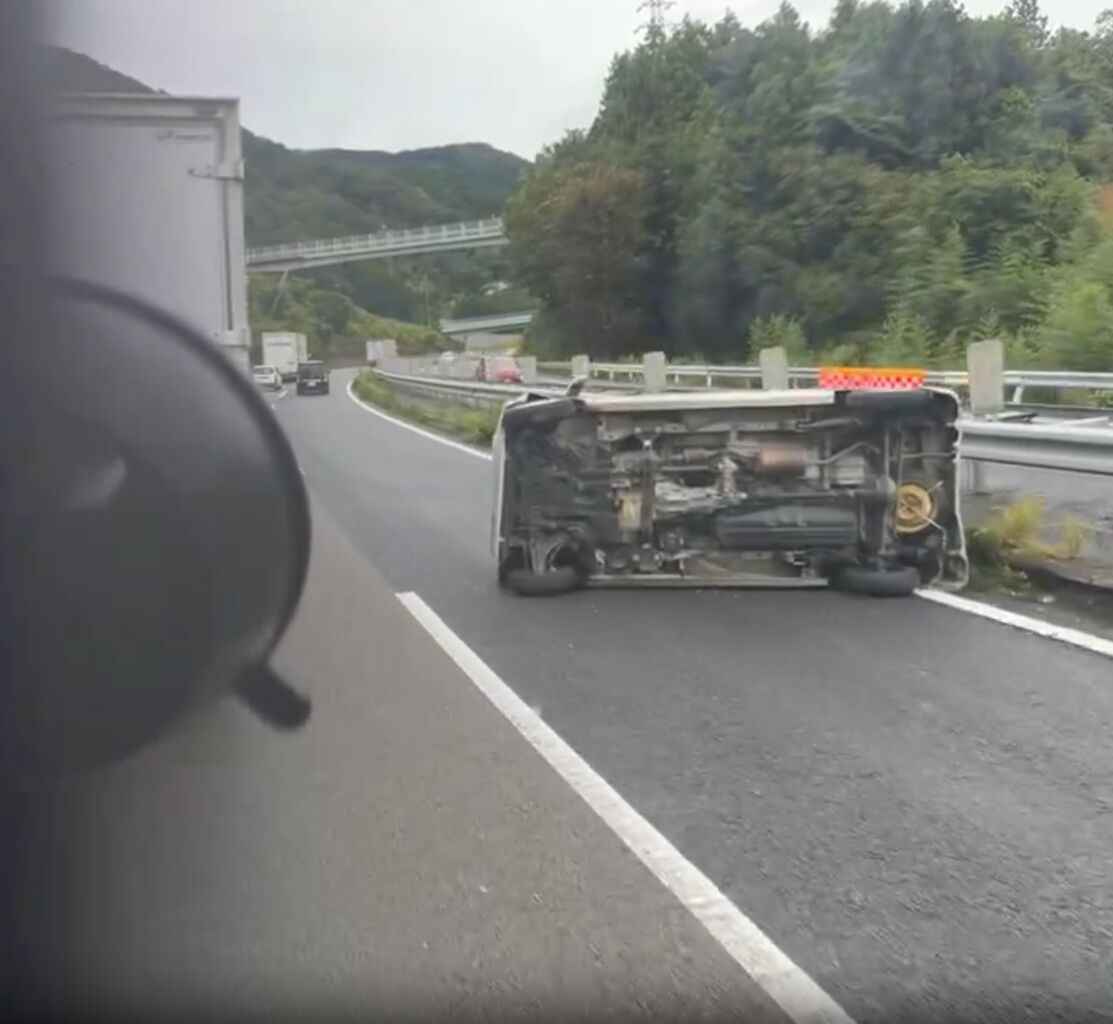 中央道相模湖付近で軽トラ横転してんな