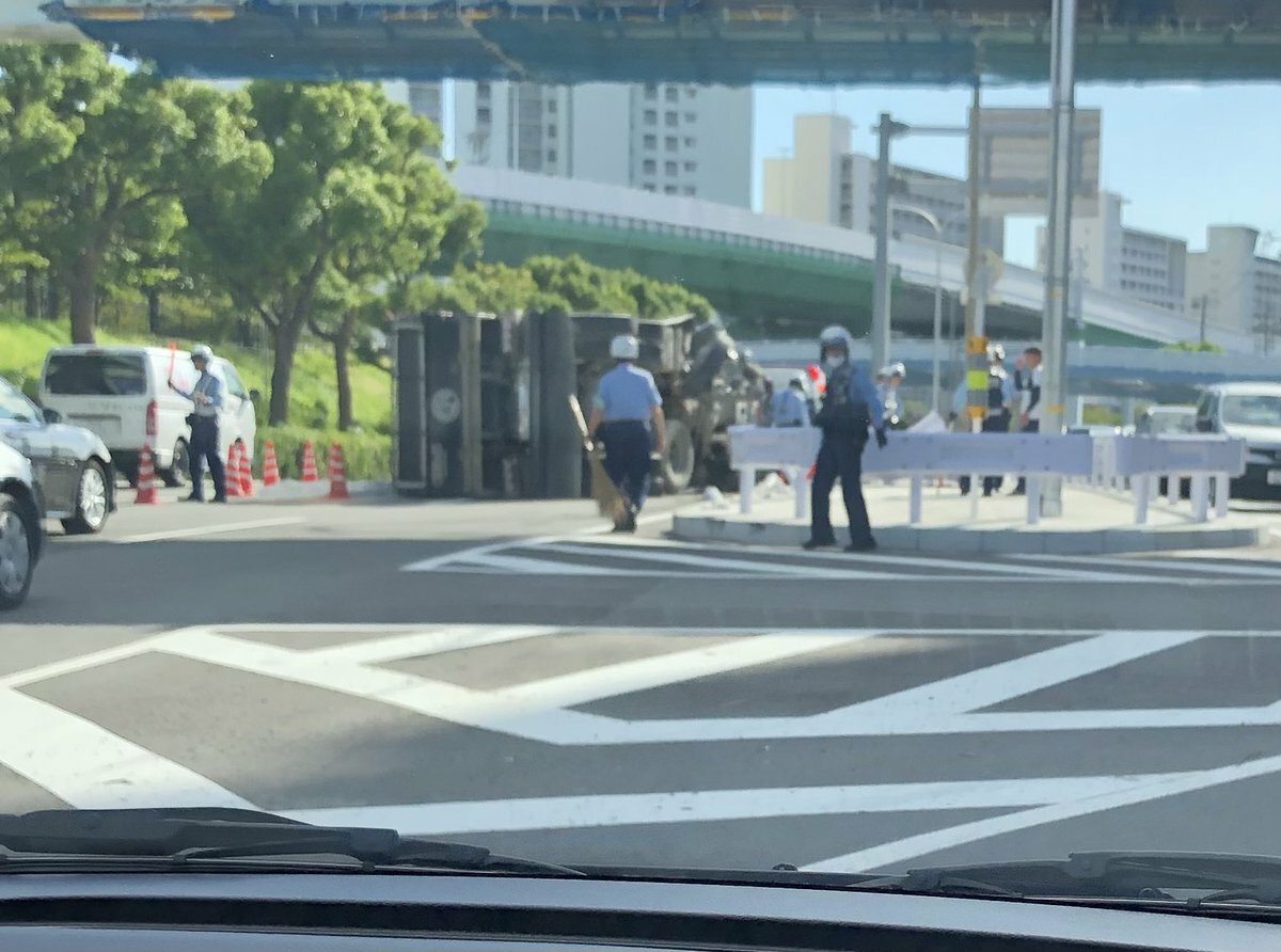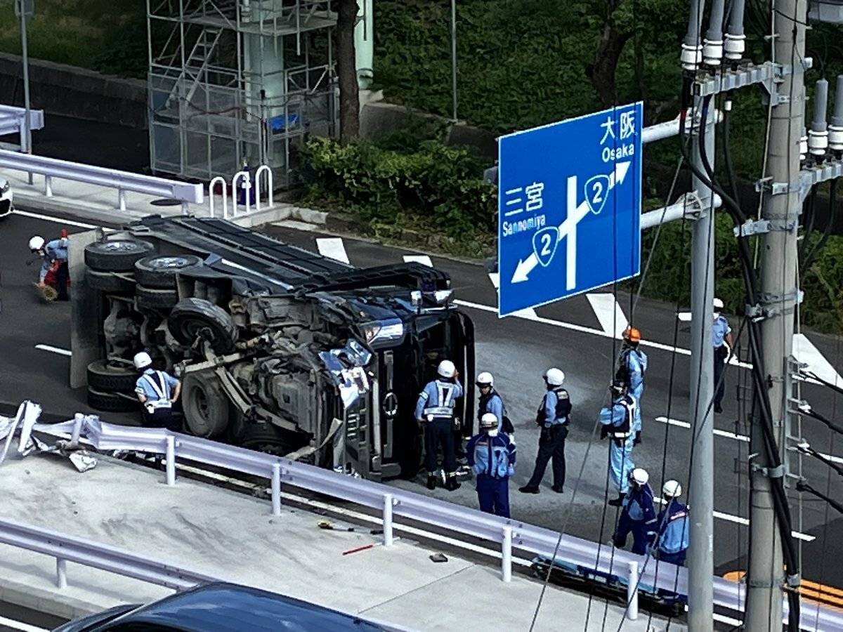 阪神春日野道駅近くの道路でトラック横転してる pic.twitter.com/Ujmf7FVSPZ