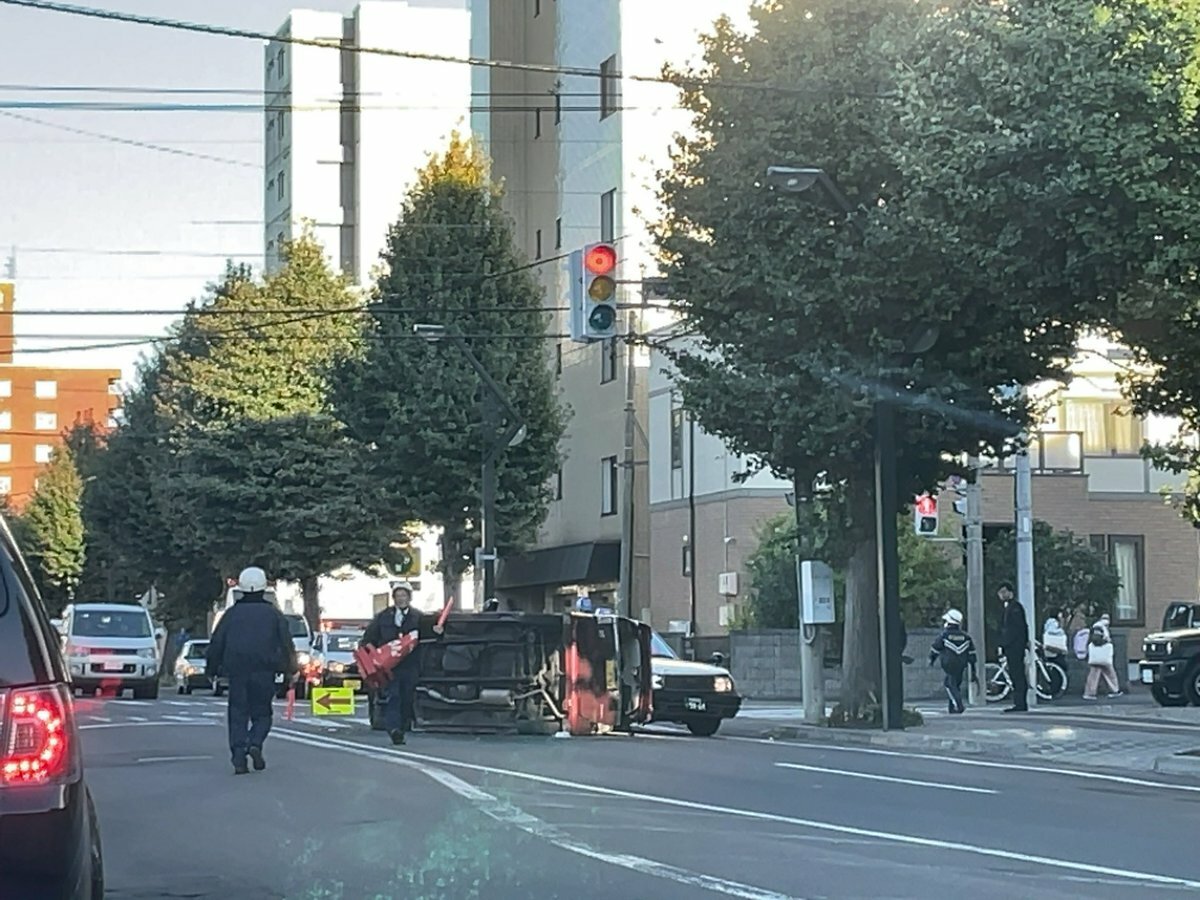 【現場の状況】#交通情報 菊水・旭山公園通 札幌市中央区南9条西15丁目付近交差点 車線塞ぐ衝突横転事故で規制渋滞10月13日 #渋滞 #札幌 #3連休