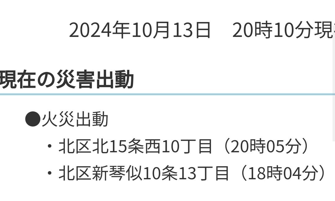 ◆札幌市北区北15条西10丁目付近に火災出動中です。