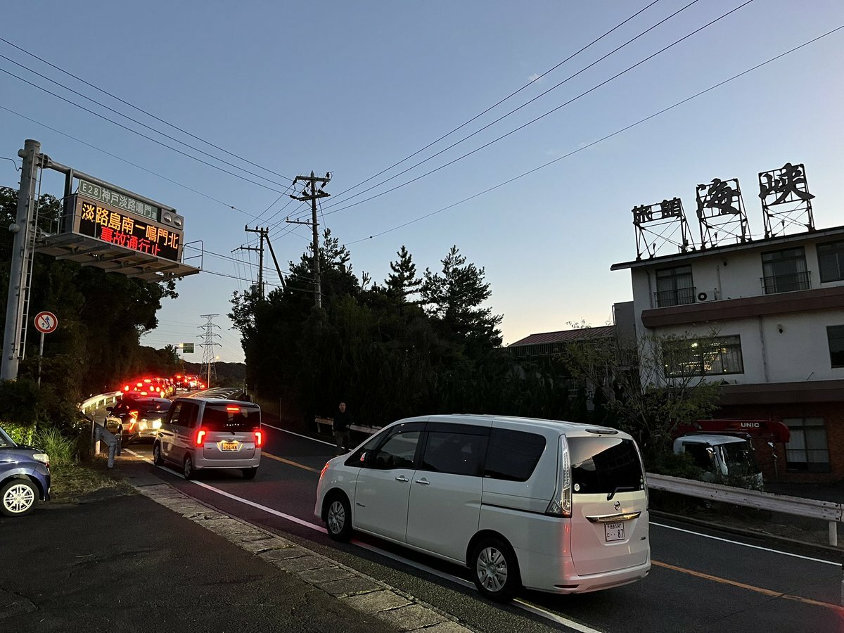『淡路島高速下り重大事故が起こって、鳴門海峡の下りは通行止めです。
