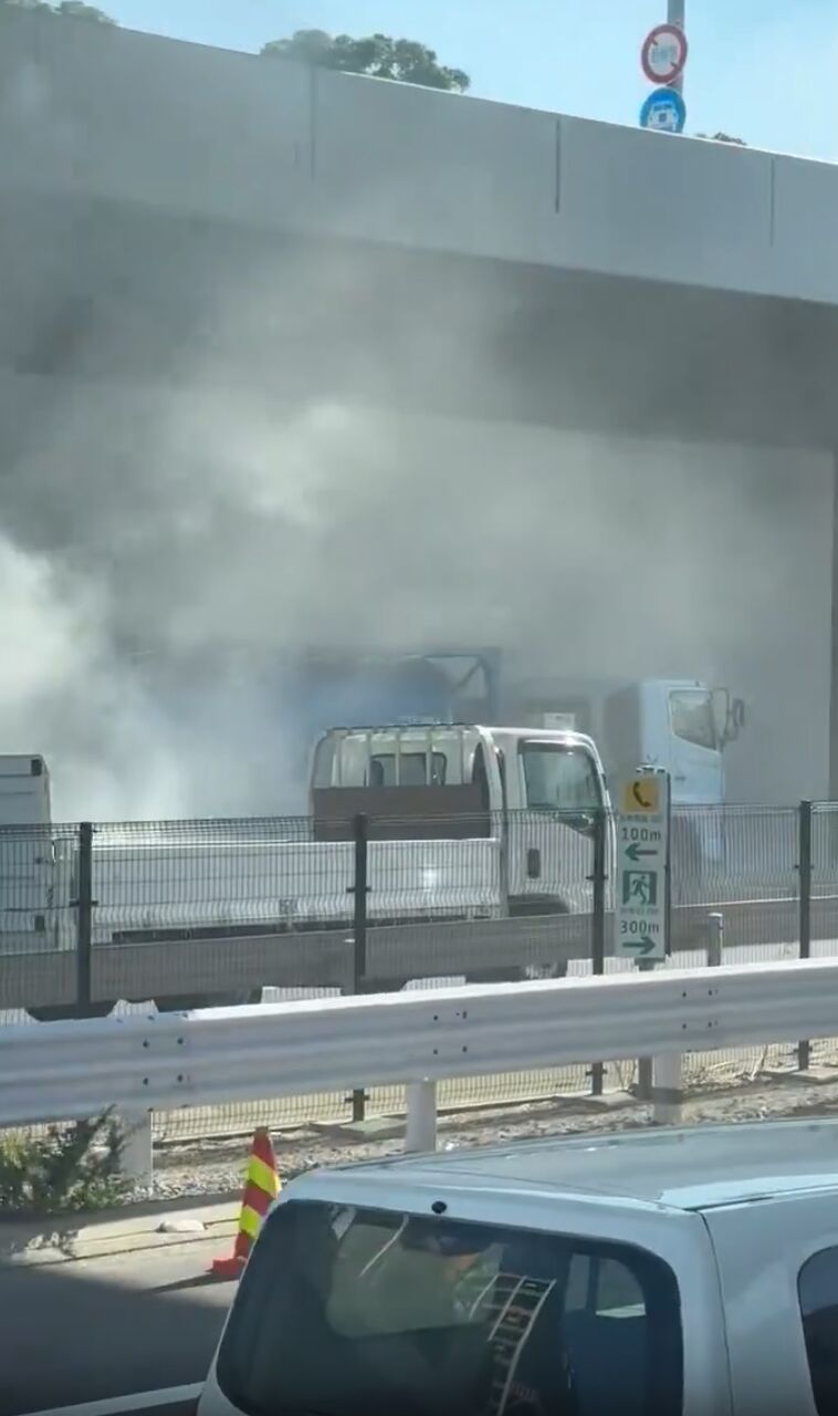 首都高速湾岸線の 臨海副都心 西行き 入口 真下辺りの一般道 国道357号線 で 大型車の火災 かな? すごい煙です#gogomonz_nack5