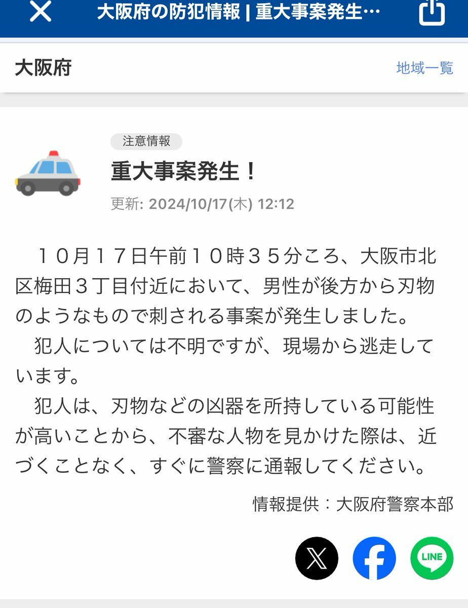 — 安全ナビ@大阪府 (@anzen_osaka) October 17, 2024