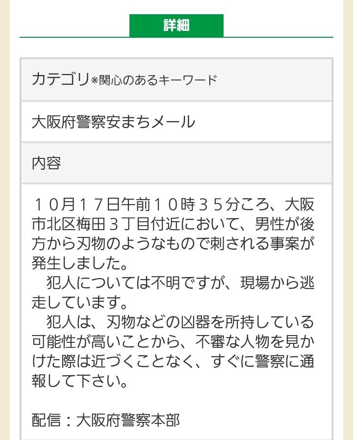 10月17日午前10時35分ころ、大阪市北区梅田3丁目付近において、男性が後方から刃物のようなもので刺される事案が発生しました。 犯人については不明ですが、現場から逃… https://t.co/n5qUf6NzyN #不審者 #大阪府 #大阪市 #大阪市北区 #梅田 #新着