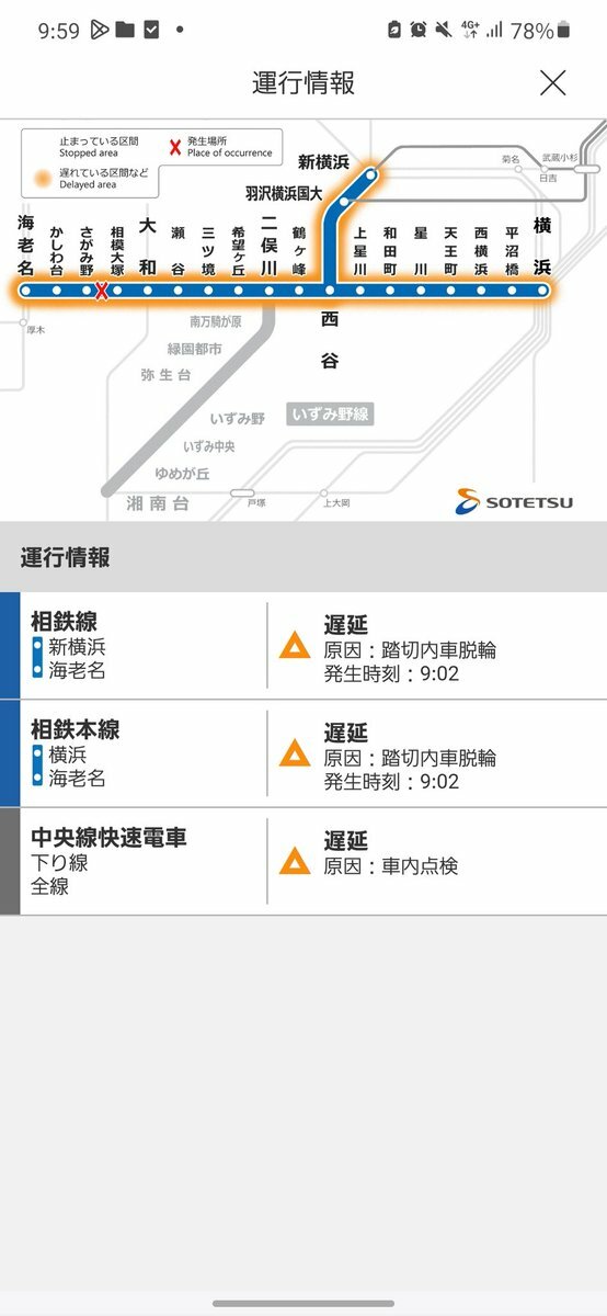 相鉄線は、相模大塚〜さがみ野駅間において踏切内で車が脱輪した影響により、横浜〜海老名駅間の上下線および相鉄線からJR線・東急線に直通する列車に遅れが発生しております。