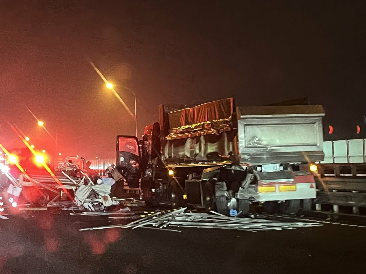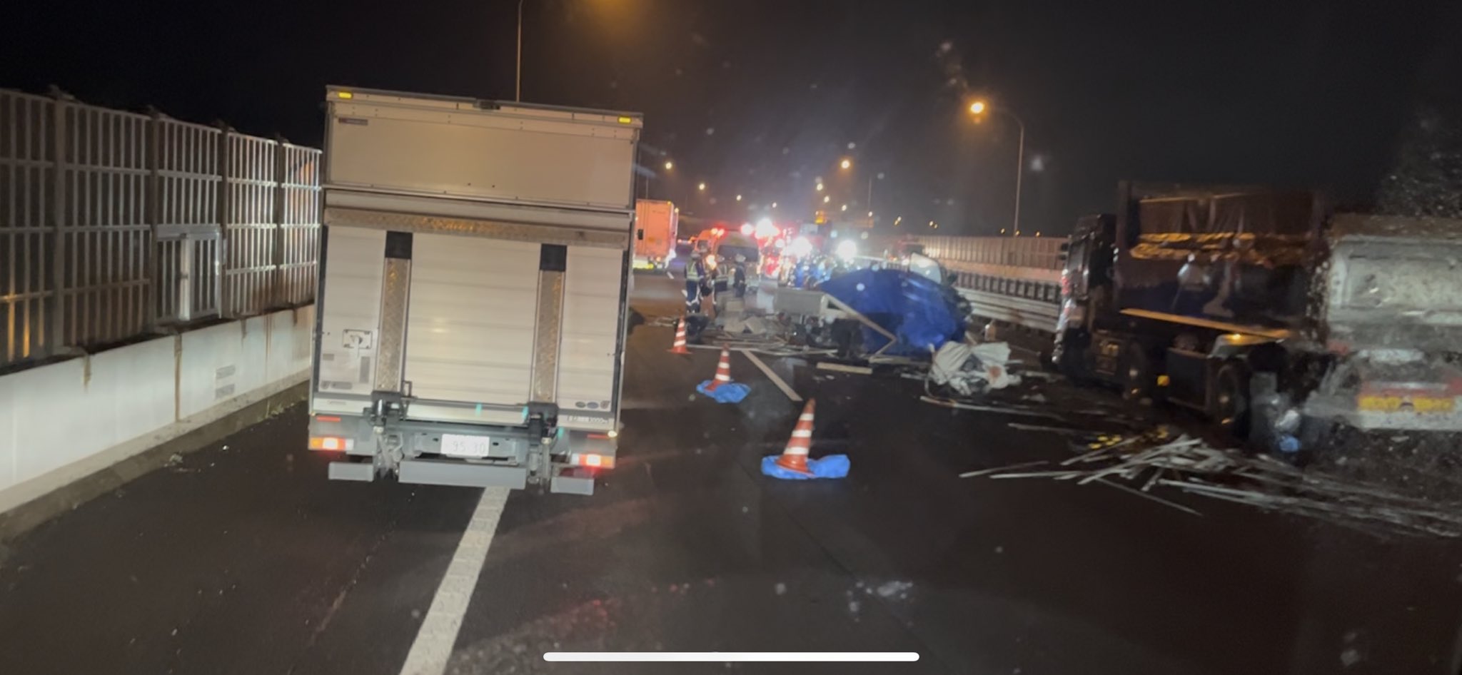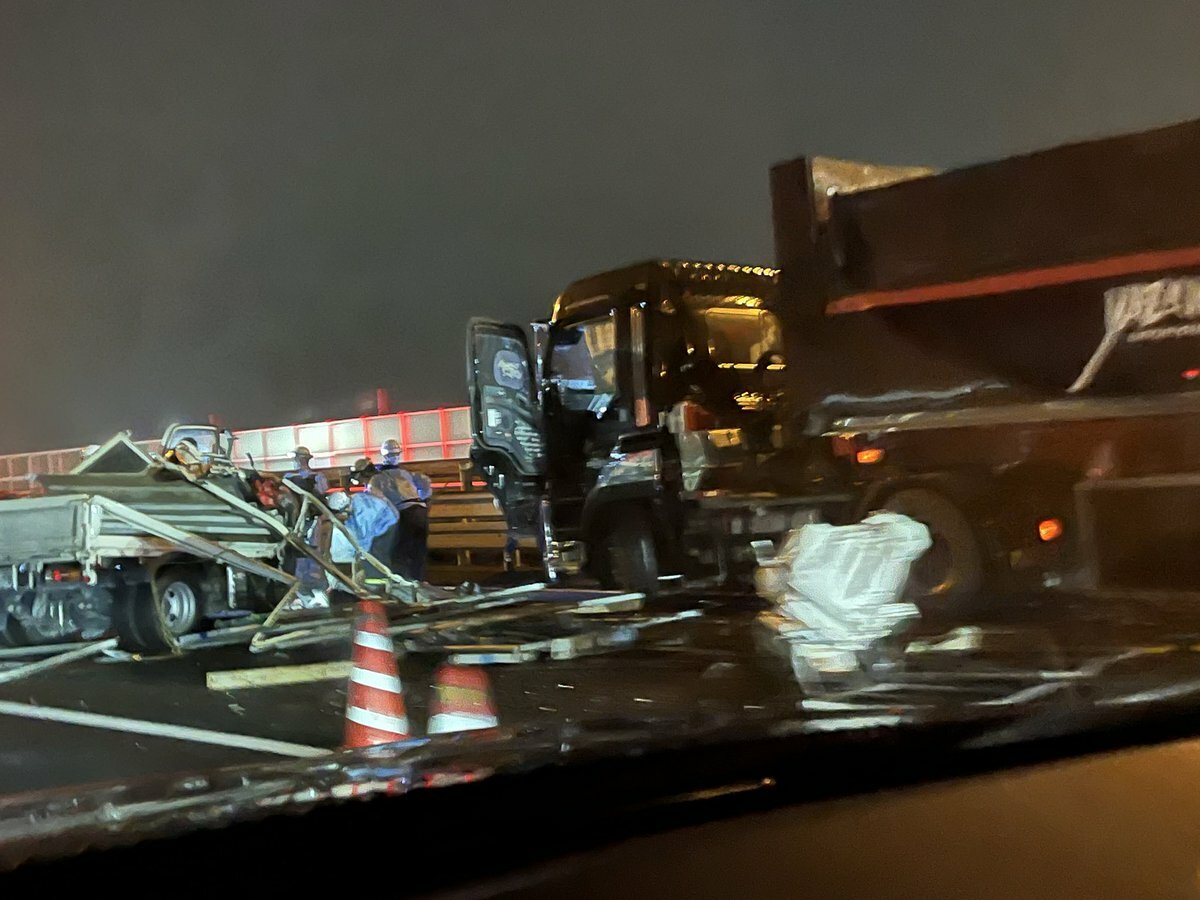 関越道下り坂戸スマート手前で砂利トレーラーと足場屋トラックの死亡事故発生 pic.twitter.com/7Tl2LEa9eF