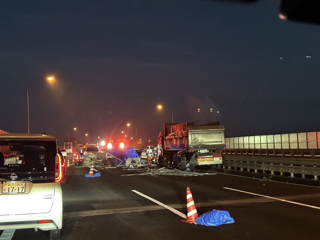 関越道、下り鶴ヶ島ICの先でこの時間から3台絡んでた二車線塞ぐ事故。