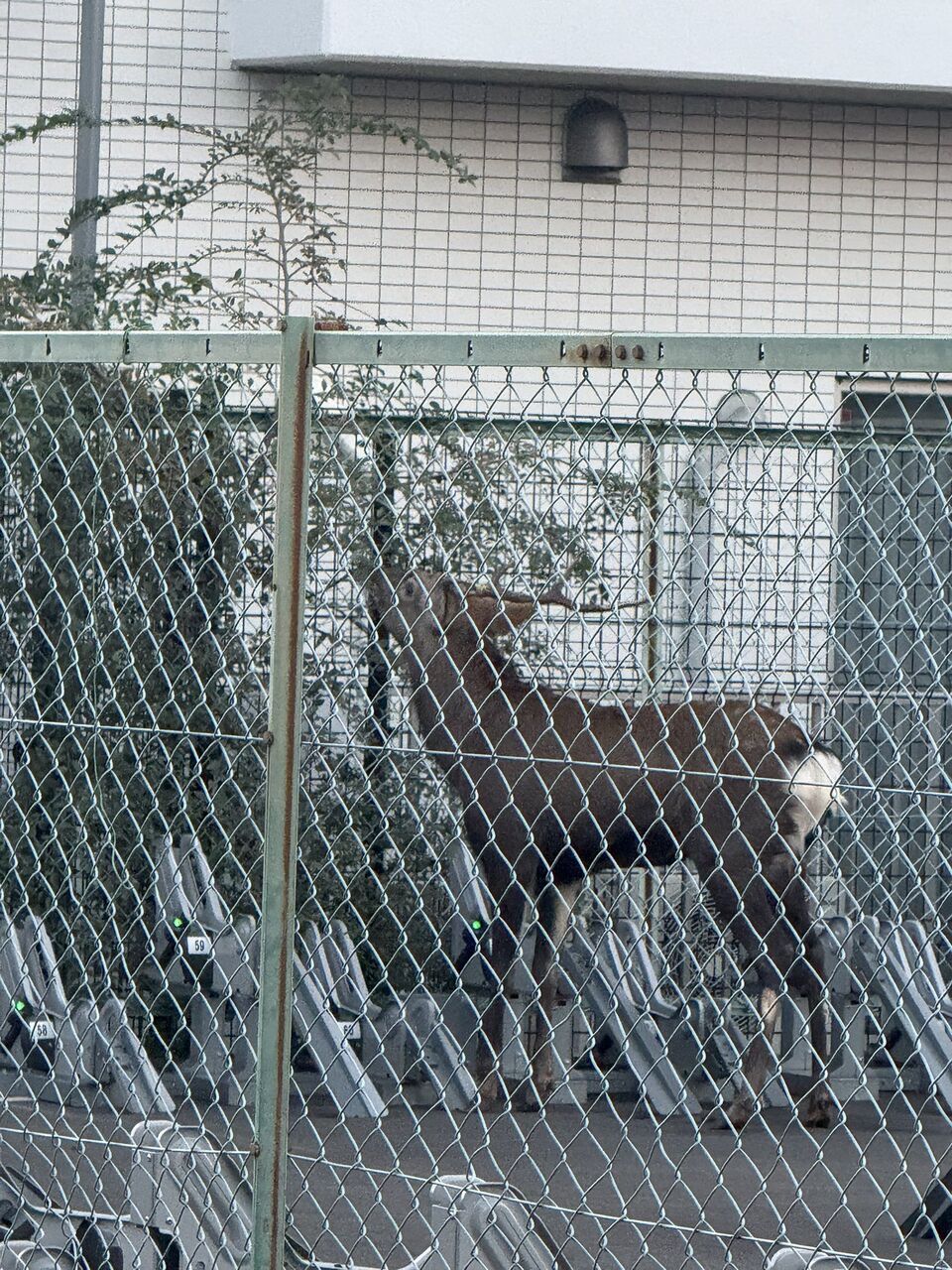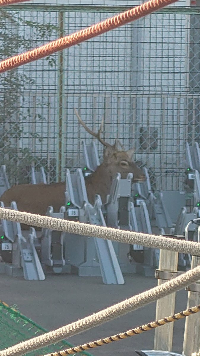 駅前の駐車場に何故か鹿がいて騒ぎになってる。多摩動物公園の鹿かな…。