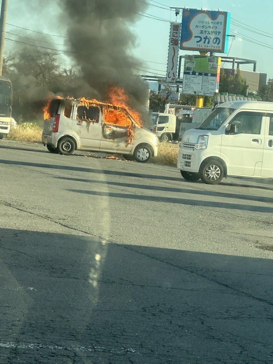 『朝から火事🔥 花咲温泉で車が燃えてる😱』