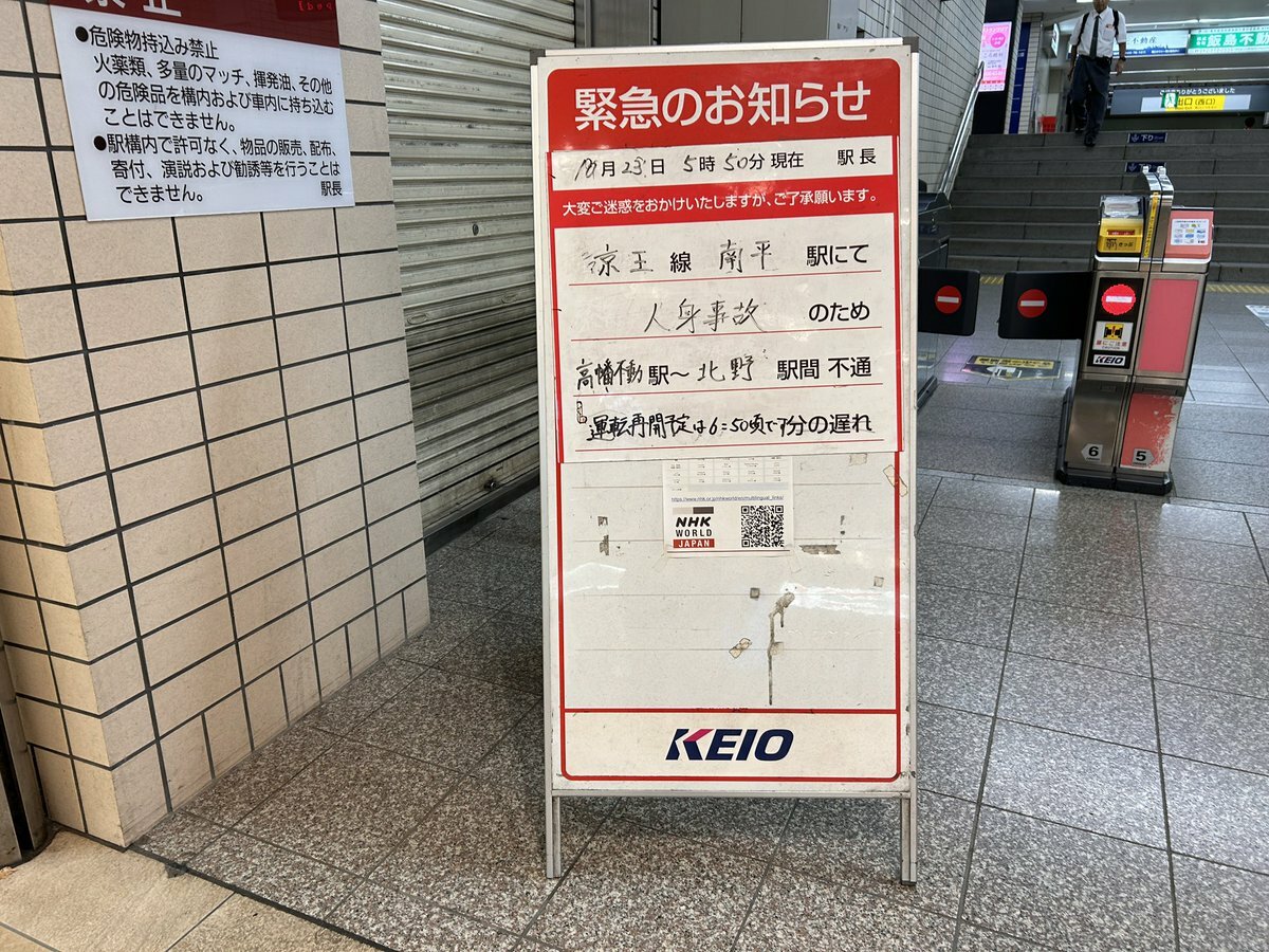 同線は高幡不動~北野駅間の上下線で運転を見合せている。運転再開は同6時50分頃の見込み。— まकƖ ıƖ ıᒐ゙ゃƕ౾੭ੇƖ ı੭ੇ၈ (@abe_yamagami) October 22, 2024