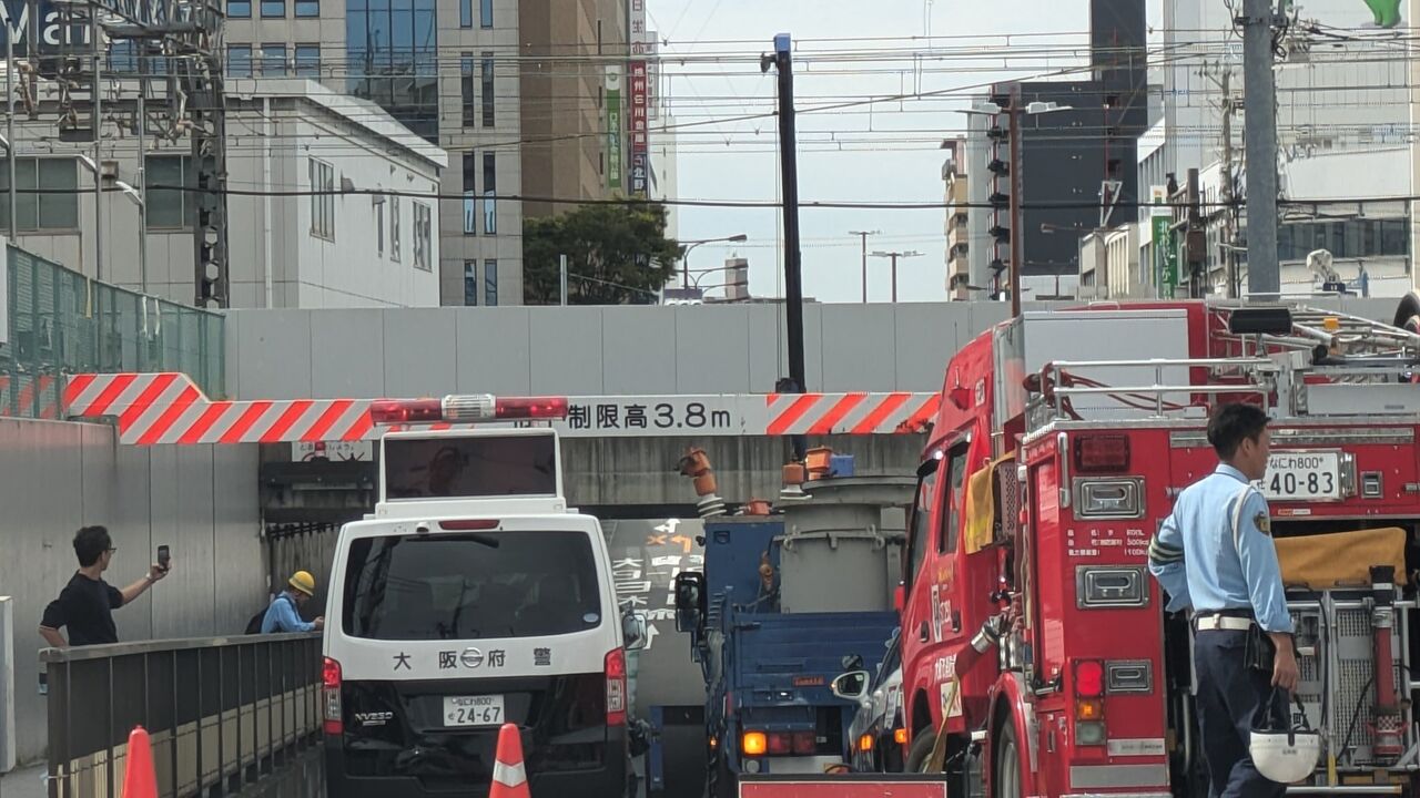 『阪急十三駅の高架下片側通れなくなってた! 警察と消防車いっぱいで何事かと思った⚡️』