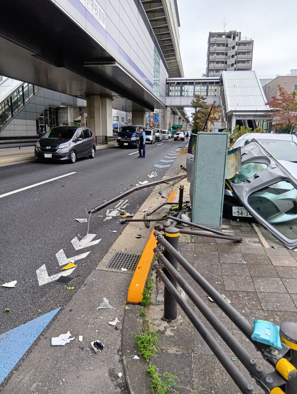 【現場の様子】#交通情報 尾久橋通り 東京都荒川区東尾久 赤土小学校前駅付近 ガードレール街灯街路樹なぎ倒し歩道に突っ込む事故で車線規制10月25日 #渋滞 #荒川 #赤土小学校前