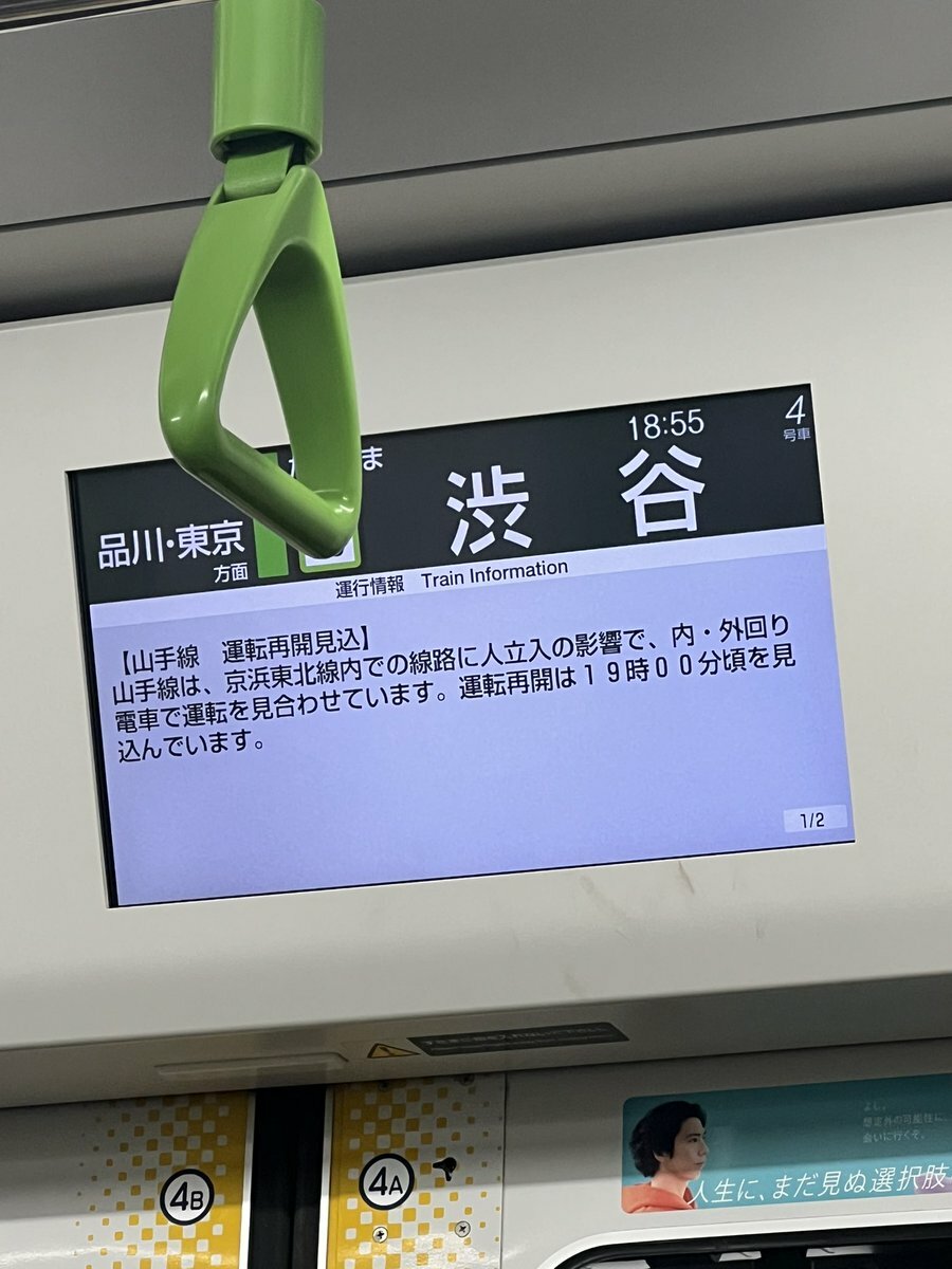 府中からの帰り、山手線渋谷駅にて…品川駅付近で線路内に人が歩いているとのことで停車中😥誰だよ😖