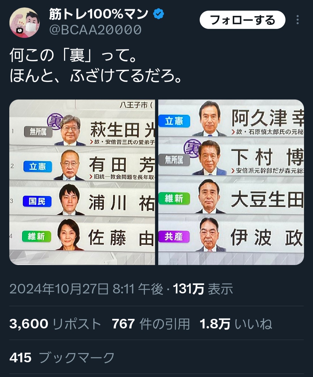 【速報】 選挙特番で放送事故wwww 2024/10/27 速報 1: — (@BCAA20000) document.write(” + ”); 関連記事 document.write(” + ”); 続きを読む ——— Source: アルファルファモザイク 【速報】 選挙特番で放送事故wwww
