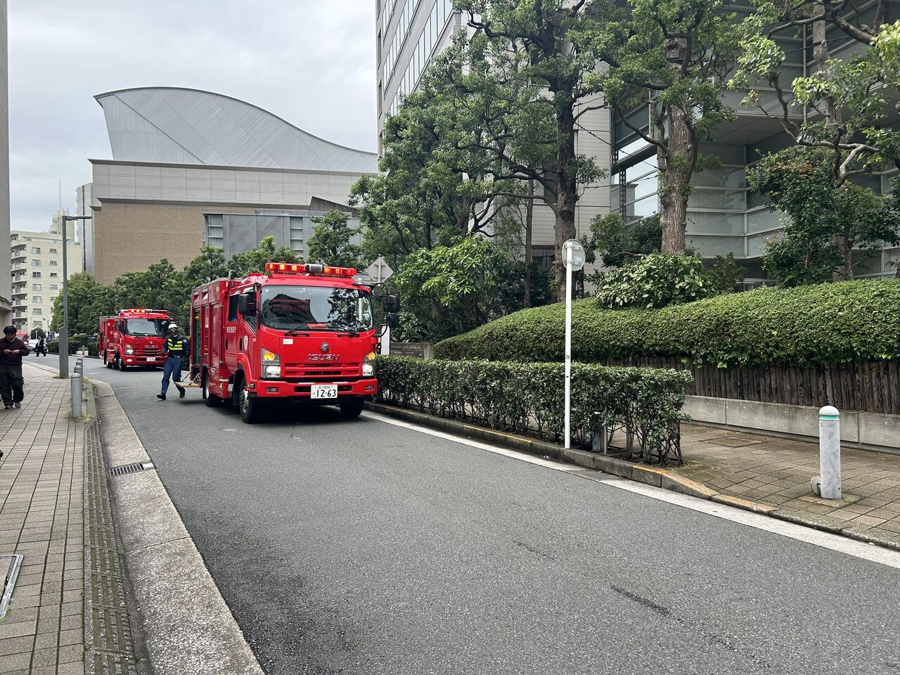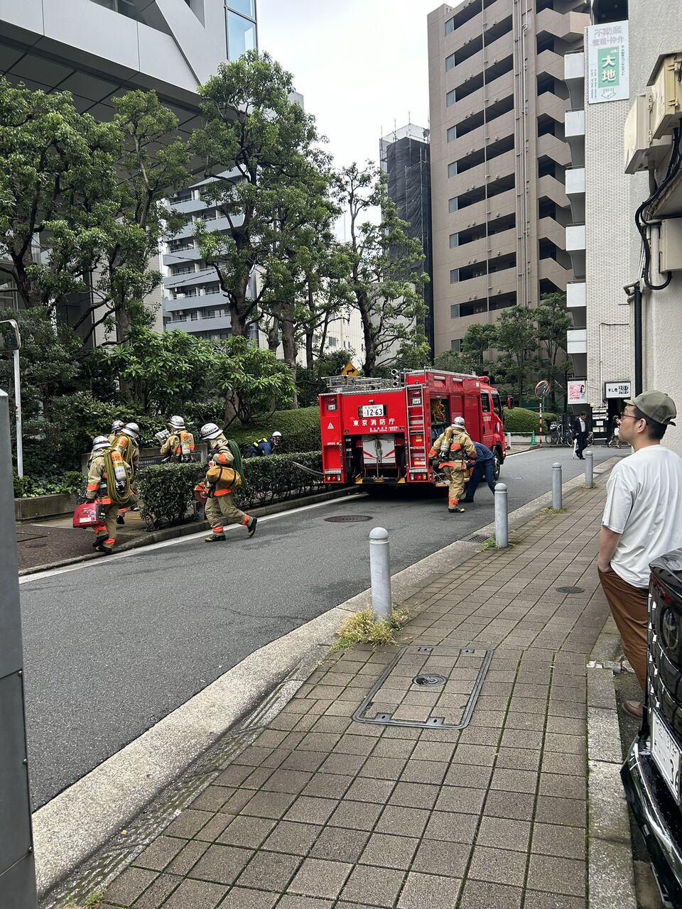 『蒲田のアプリコ 前に 消防車が数台、救急車、 パトカーが止まっていますが 火や煙は見えません』