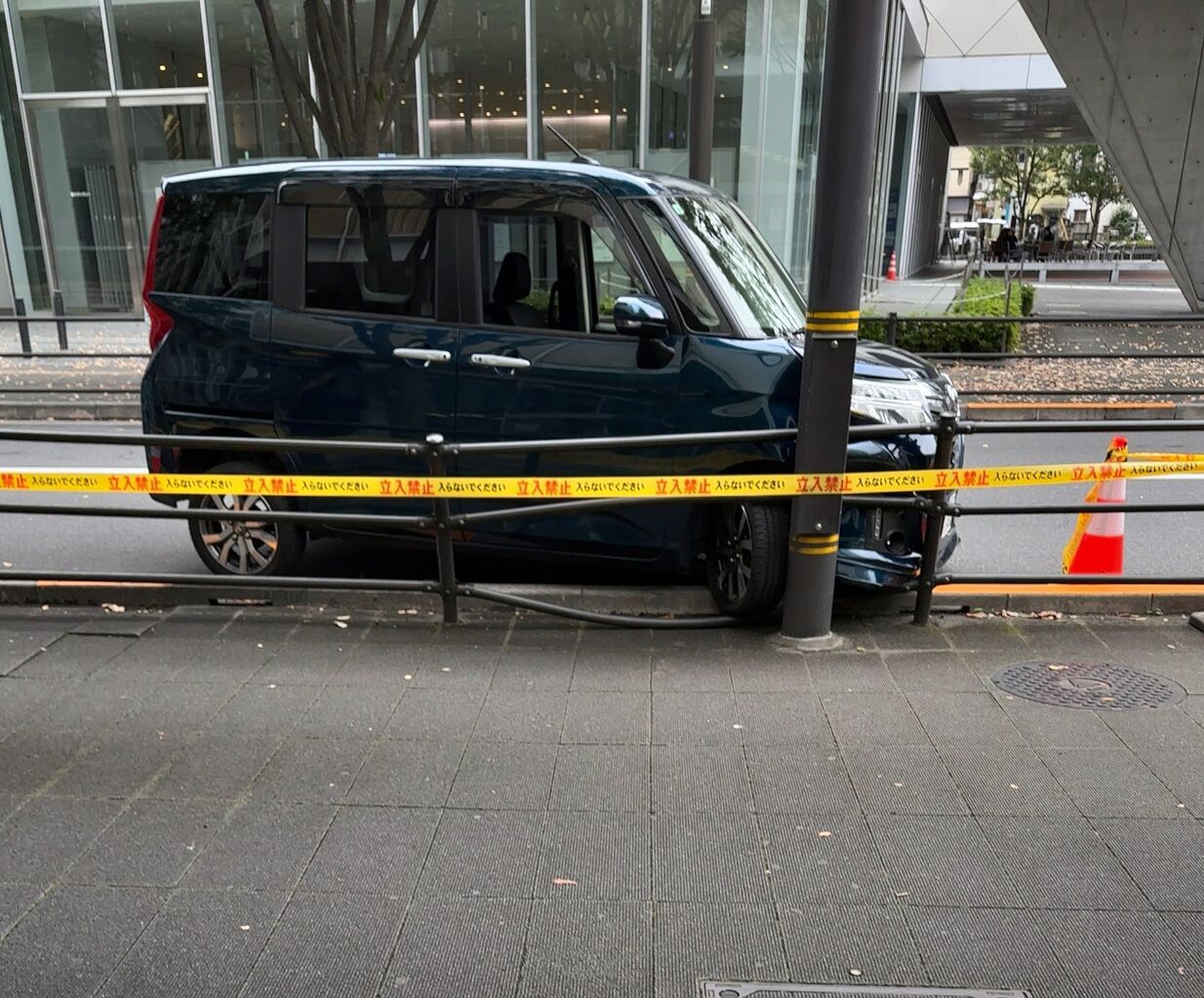 【現場の様子】#交通情報 電大通り 東京都足立区千住旭町 北千住駅東側 東京電機大学2号館付近 ガードレールに軽自動車衝突事故10月28日 #足立区 #北千住 #電大