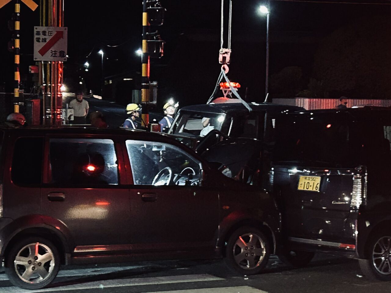 あちゃー。原水駅の線路で事故ってる。。。線路上に大破した車あるから電車も通れてない。。