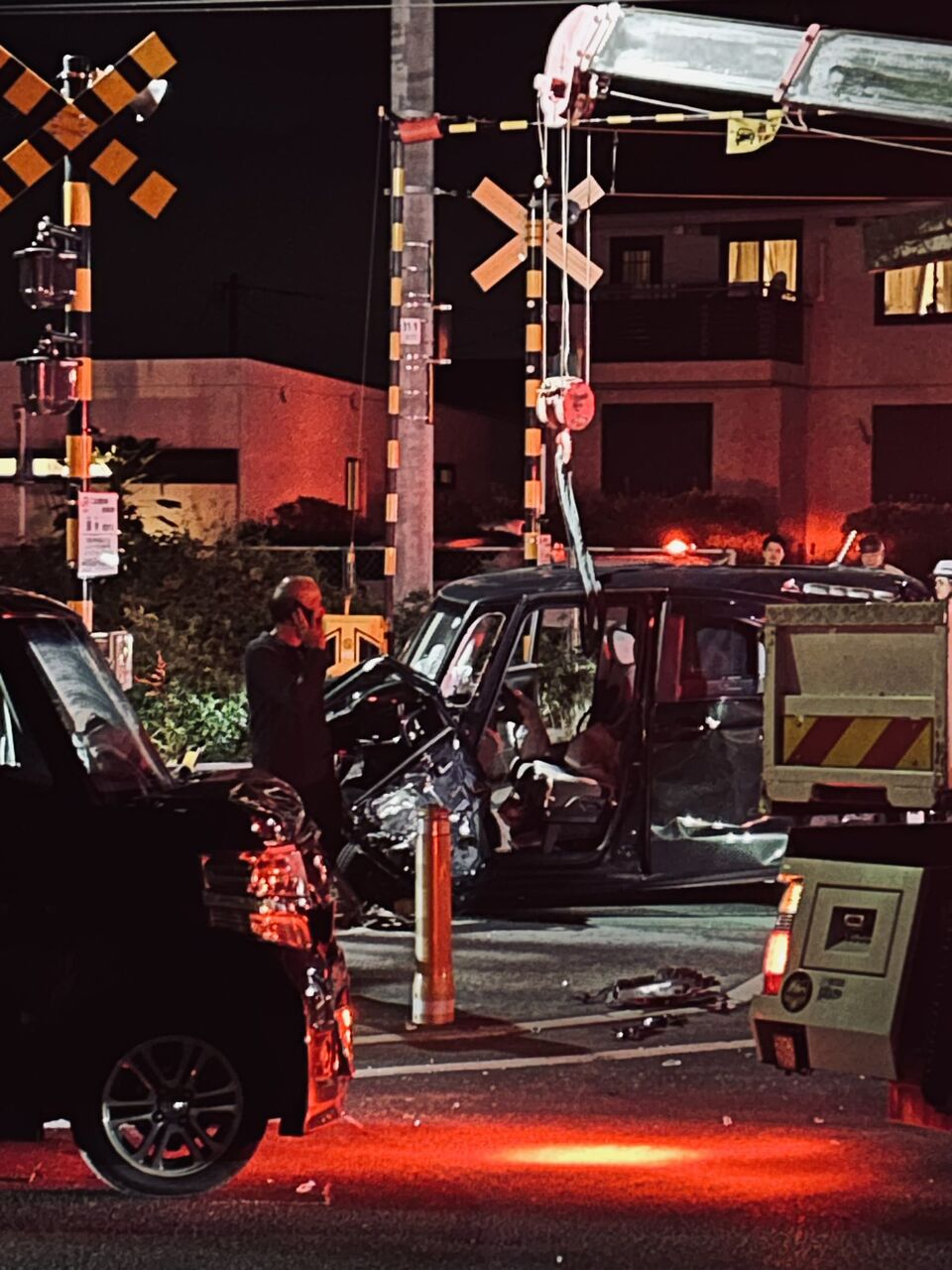 『あちゃー。原水駅の線路で事故ってる。。。線路上に大破した車あるから電車も通れてない。。』