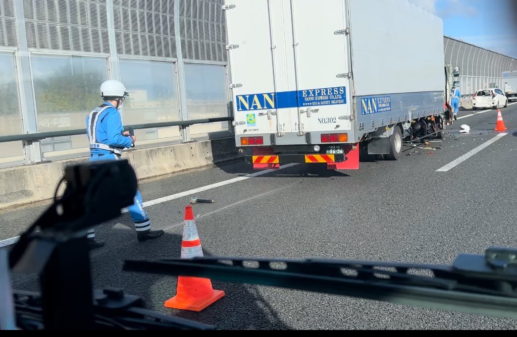 『久御山ジャンクション手前で、どえらい事故。トラックと乗用車に挟まれたバイクがペチャンコ。助かってほしい』