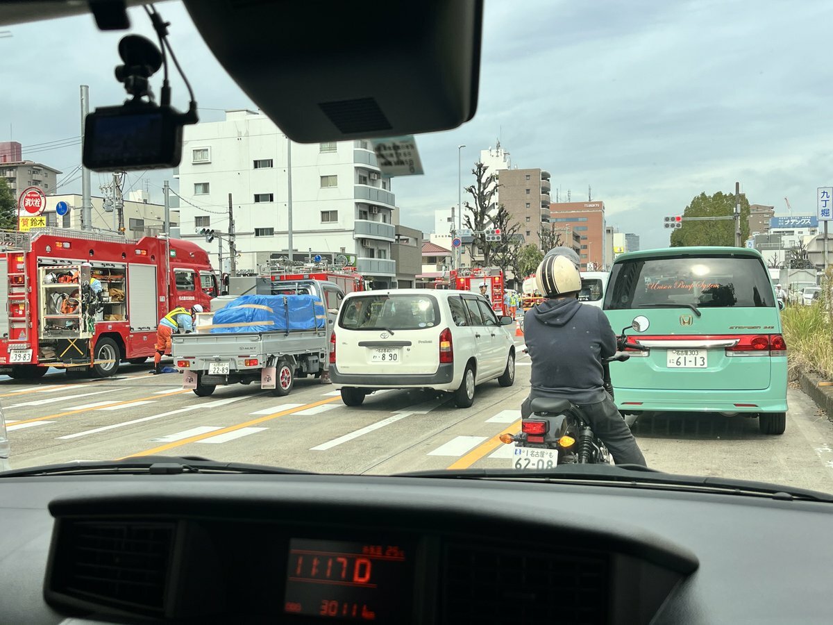 【現場の様子】#交通情報 #国道19号 北行き 名古屋市中区古渡町交差点 自転車に乗った20代女性タンクローリーにひかれ下敷きになる重大事故で一部通行止め渋滞11月1日 #名古屋 #金山